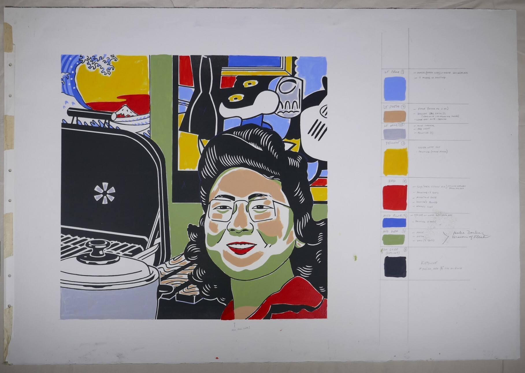 DescriptionThis hand-colored cartoon with color chart and notations in the right-hand margin depicts at the lower right, the head and shoulder of woman of Asian heritage with black hair streaked with white; pompadour on top and curls by her proper right ear. Glasses with square lenses, smile with red lipstick; red blouse. Above her a work of abstract art in black, white, blue, yellow, and red. On the lower left, a covered casserole pot in grey with a white (glass?) cover with a black handle. Behind it, a grill with the cover pulled up and a small fan in the center of the top. Above the grill, a print with a wave in blue and white against a red sea and yellow sky.Provenance