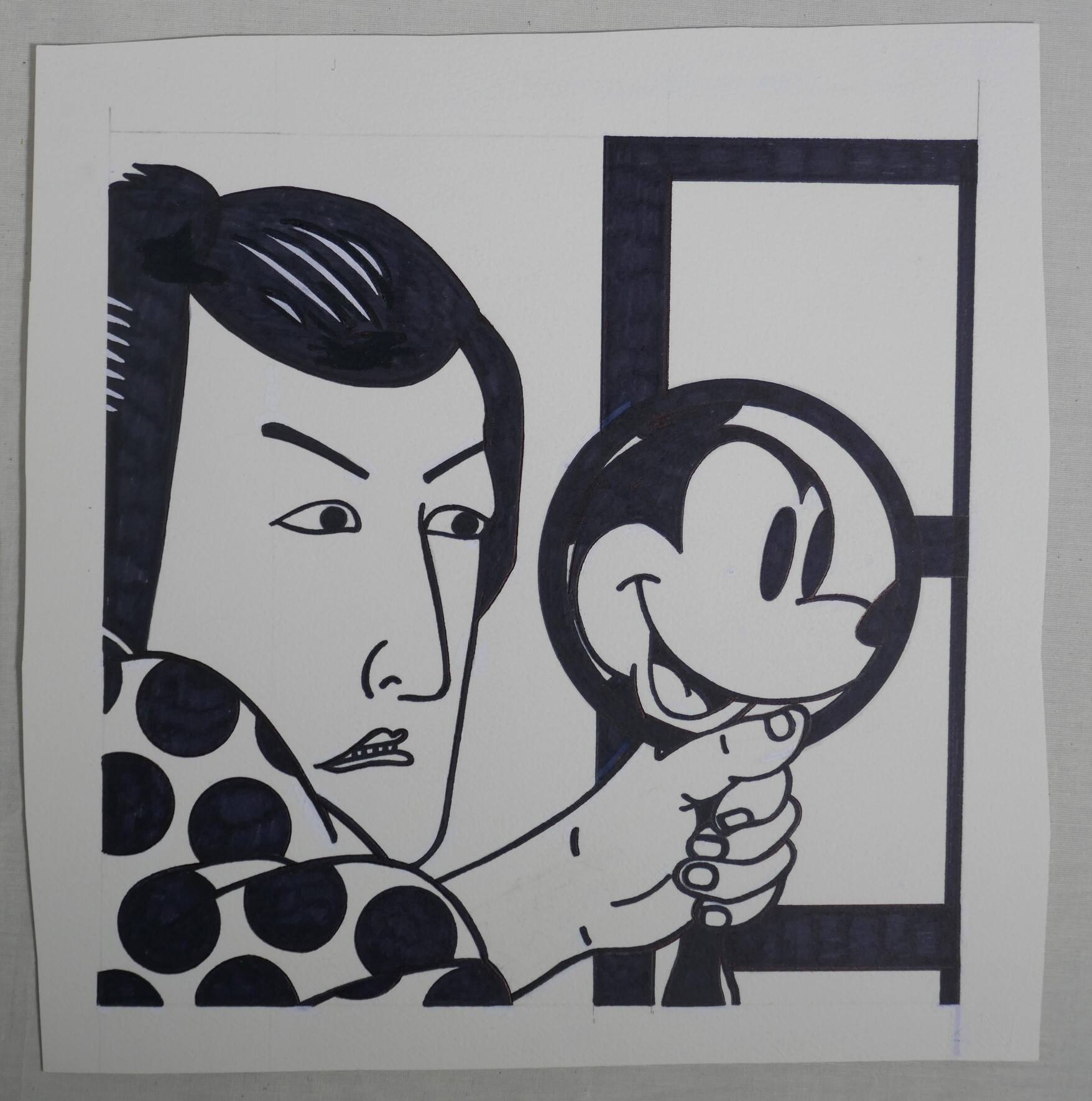 DescriptionKey drawing for "Mickey". The head and shoulder of a Japanese man at left. He holds the handle of a small round mirror in his proper left hand. The face of Mickey Mouse appears in the mirror. Behind the mirror on the right, a window.Provenance