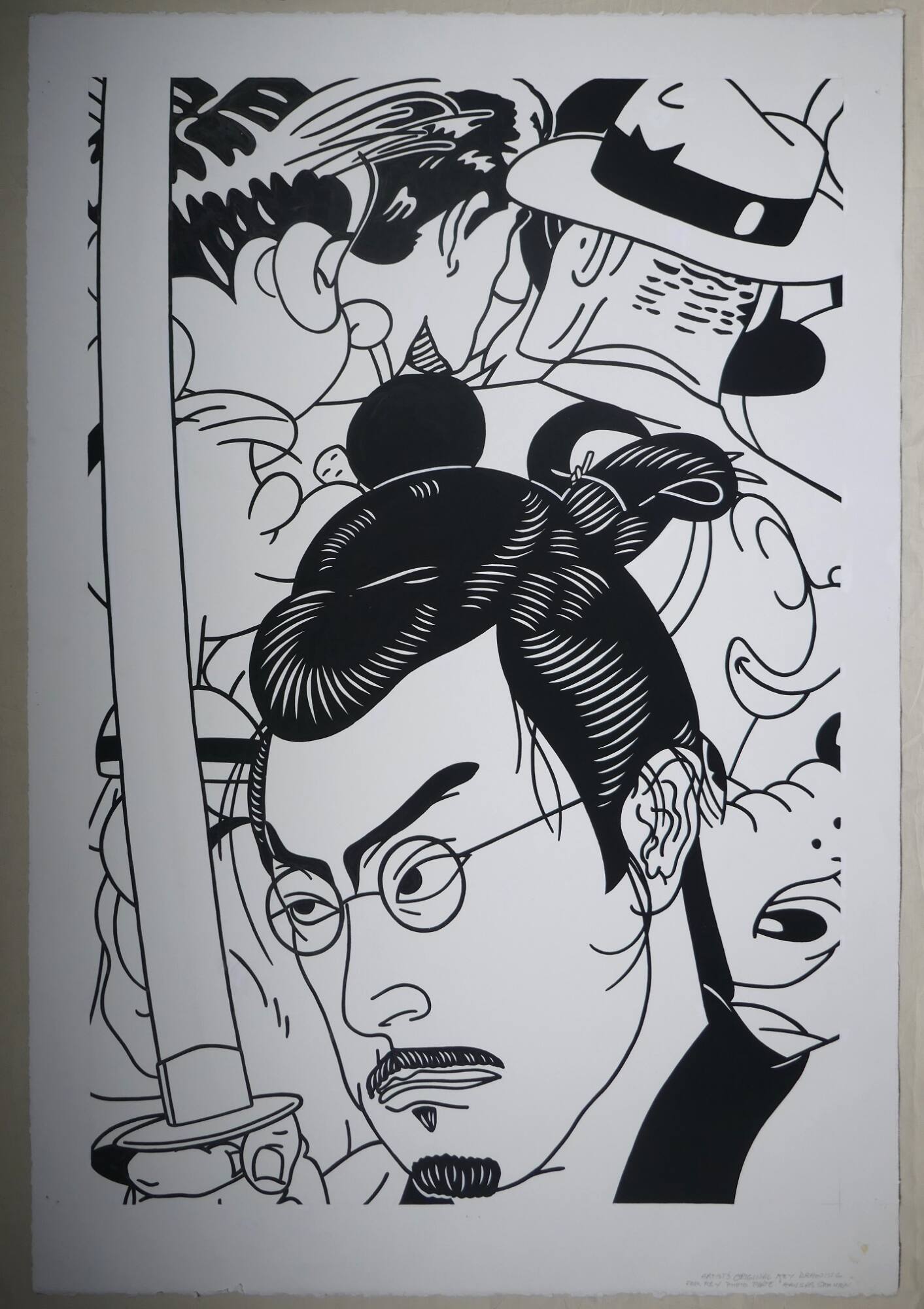DescriptionBlack and white drawing or proof for Kansas Samurai. Head of a man in three-quarter profile facing left. He wears a black wig. He wears round glasses, a mustache and short beard. He holds a sword hilt in his proper right hand. The curved sword extends up the left edge of the page. The background has outlines of cartoon figures drawn in black: counterclockwise from the lower right: a profile of Goofy facing right; Donald Duck facing right; a back view of Dick Tracy in a brimmed hat facing left; the profiles of two men I don’t recognize; and Popeye.Provenance