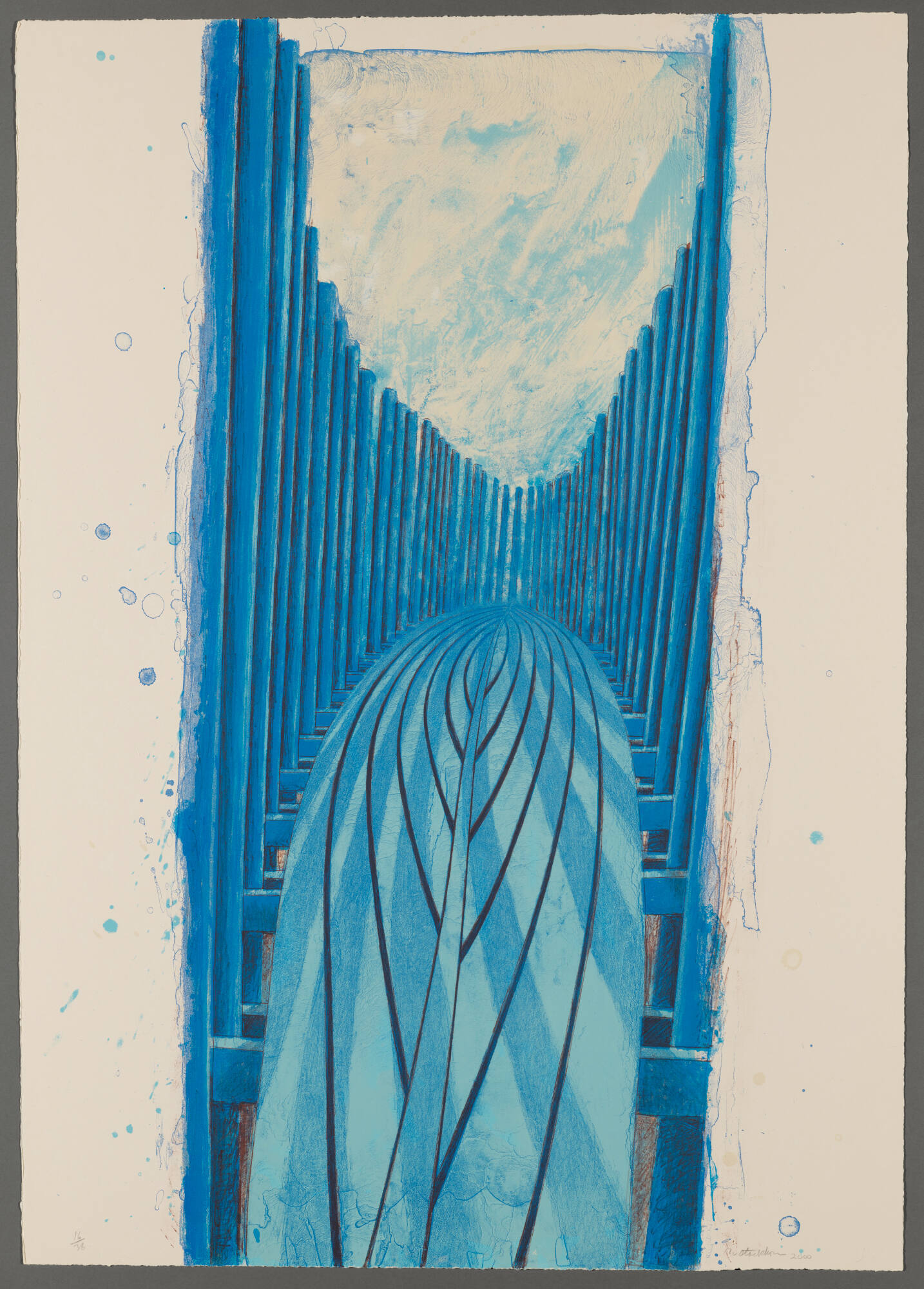 DescriptionLithograph in blue. A view down a pier (?) of blue uprights and cross-trusses. The boards of the walkway aren’t laid out straight but curve to form a tongue shape, so that they seem to rise as well as stretch into the distance.Provenance
