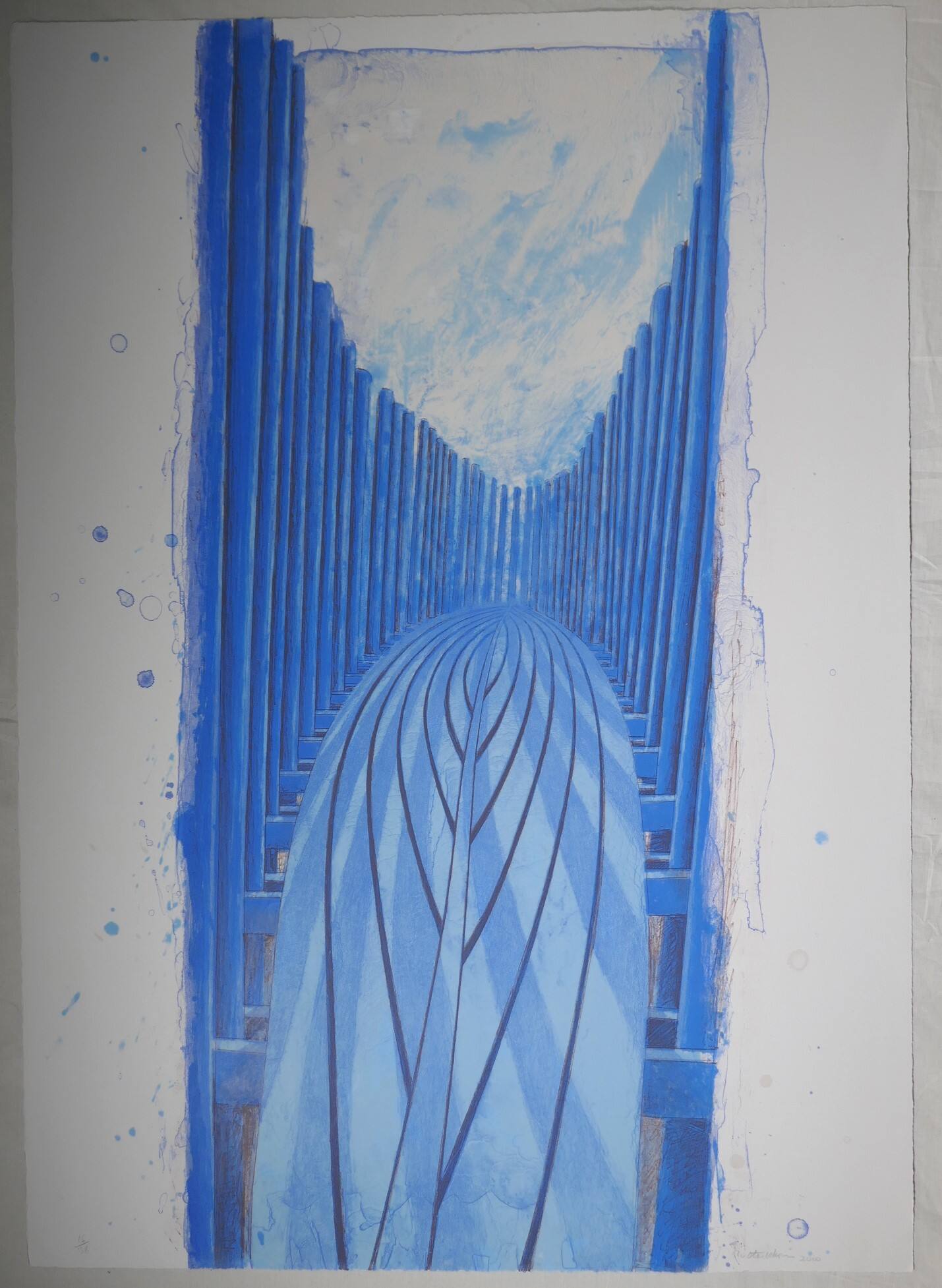 DescriptionLithograph in blue. A view down a pier (?) of blue uprights and cross-trusses. The boards of the walkway aren’t laid out straight but curve to form a tongue shape, so that they seem to rise as well as stretch into the distance.Provenance