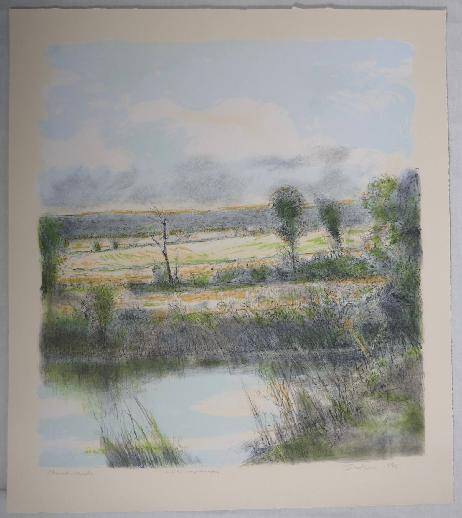 DescriptionIn the foreground, a pale blue pond reflecting white clouds. Green reeds and grasses around the pond edges. A tall tree on the right edge of the print and two trees rising out of a row of bushes in the middle ground. Green and yellow fields beyond that with a grove of trees in the background. The top third of the print is blue sky with thunderheads that are white on top and grey on the bottom.Provenance