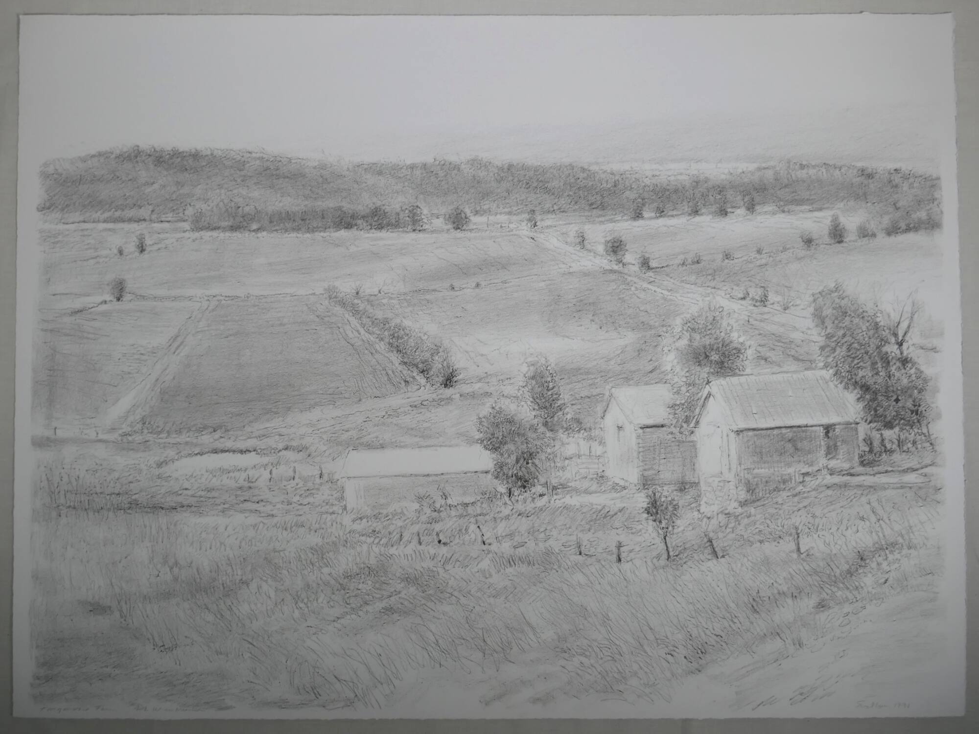 DescriptionThis lithograph is a landscape of three farmhouses and several fields. Mountains rise in the background and trees mark the grid-like formation the fields.Provenance