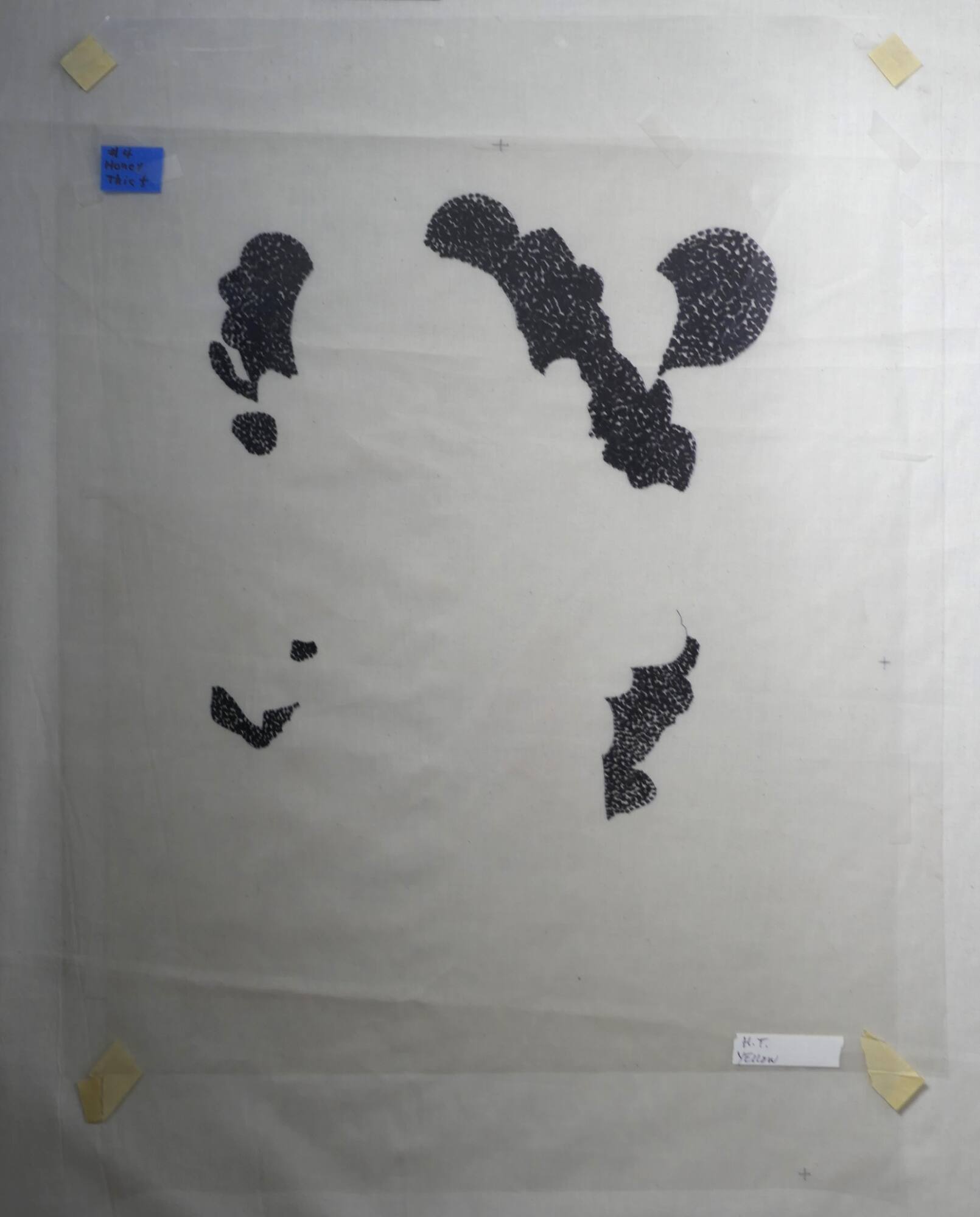DescriptionThis key mylar for "Honey Thief" includes dark amorphous areas composed of tiny dots that surround a void at the center and correspond to the yellow ink in the finished lithograph.Provenance