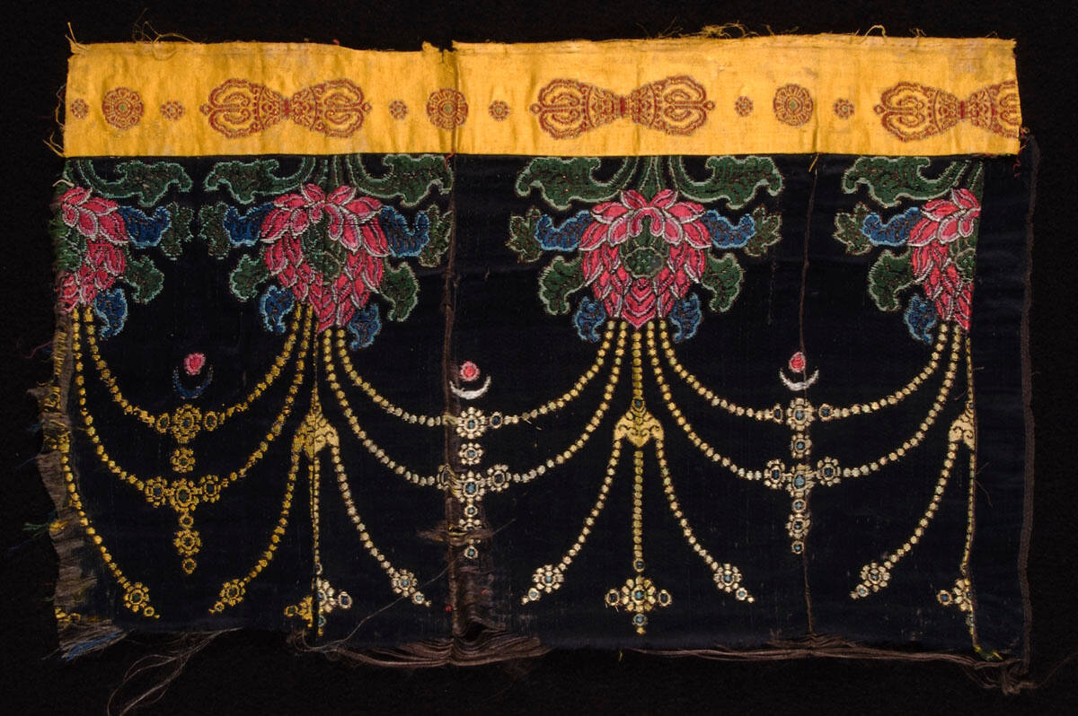 DescriptionDark blue satin brocaded in polychrome in deign of lotus with pendant jewles. Strip of yellow satin ribbon brocaded in red vajras and medallions sewn on one end.