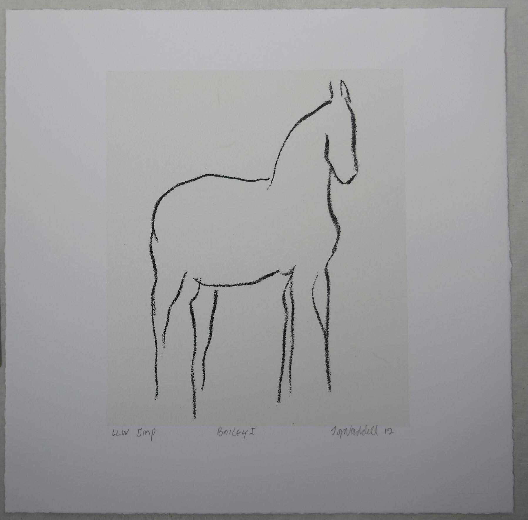 DescriptionStanding horse seen in three-quarter view facing right. Outline drawing with no facial features or hooves.Provenance