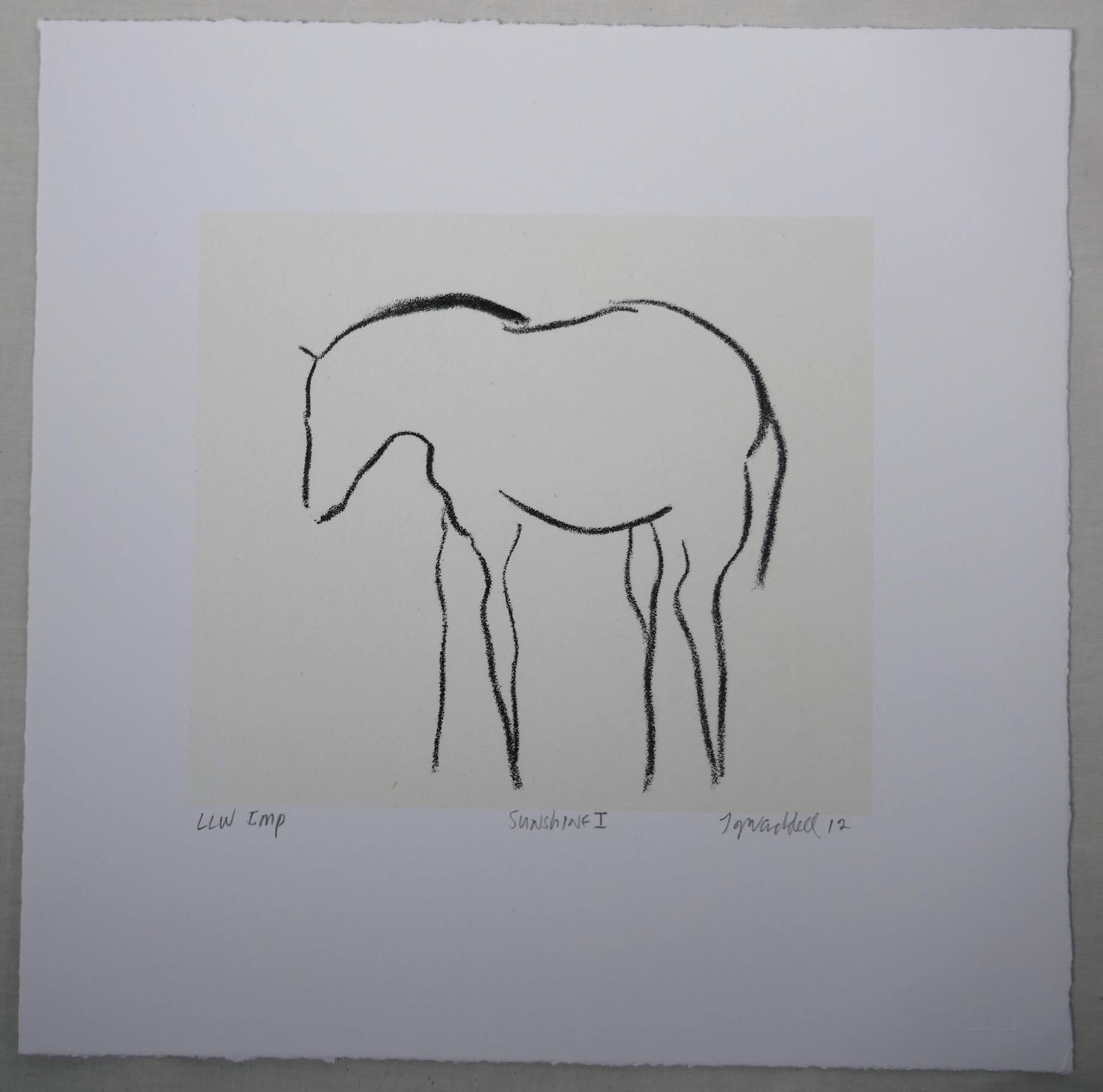 DescriptionThis lithograph with chine collé is a simple black contour line drawing of a horse standing in profile and facing the left edge of the paper. It has no facial features, mane, or hooves.Provenance