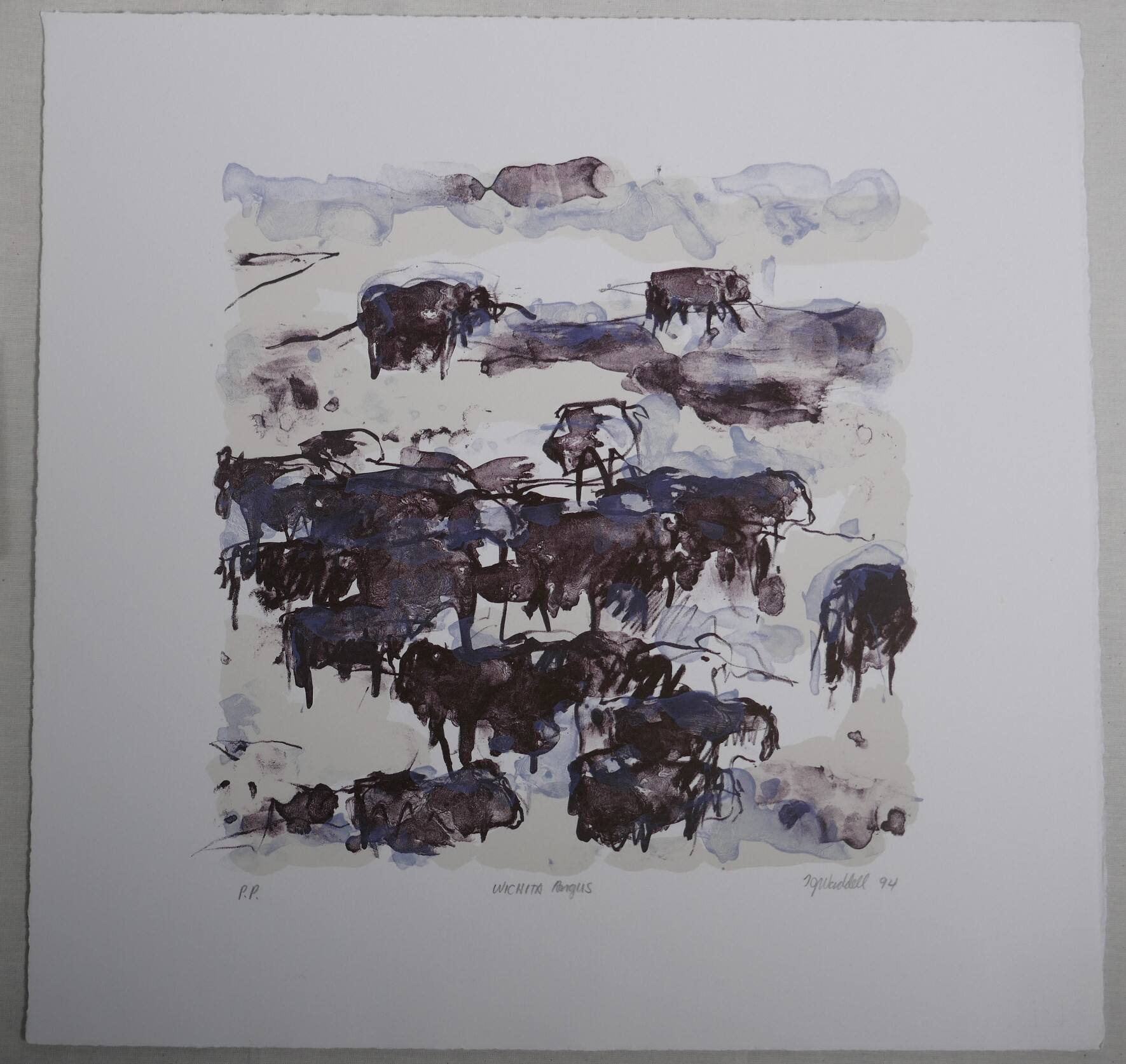 DescriptionBrown-grey cattle in a tan landscape. Most of the herd occupies the lower half of the print. Two lone cows are on hills in the upper half of the print.Provenance