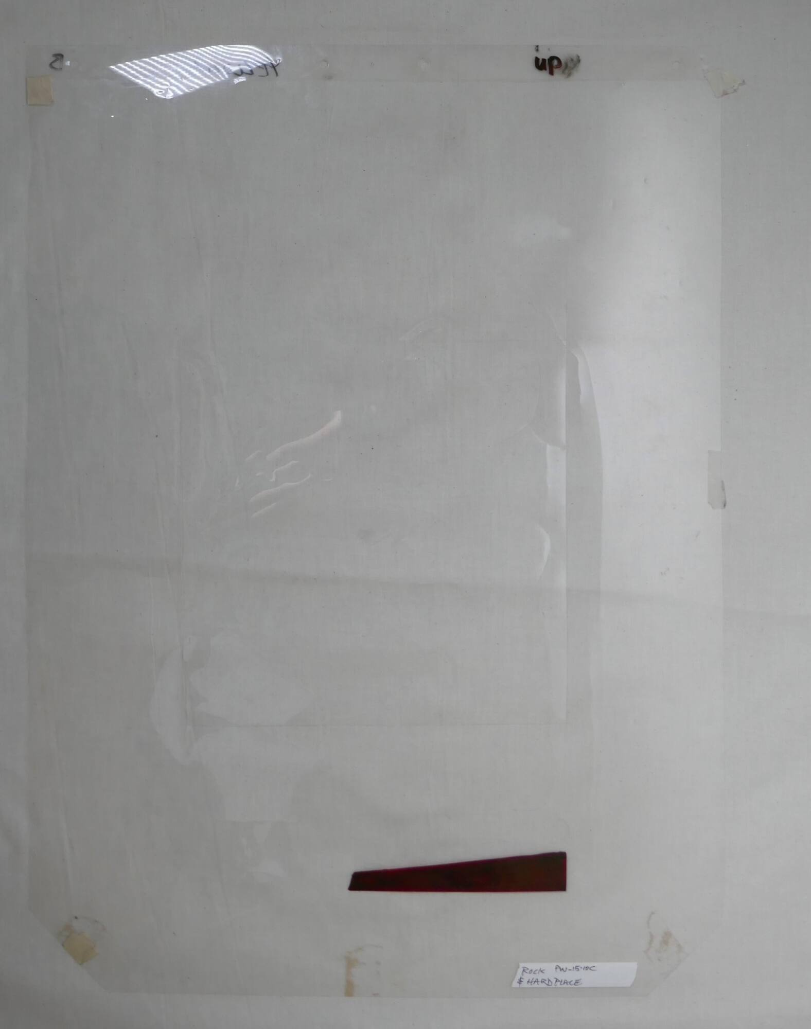 DescriptionThis the proofing mylar for the yellow ink used in "Between a Rock and a Hard Place". It reads as a sloped form at the lower right of the mylar. The word UP is near the upper edge of the mylar towards the right side.Provenance