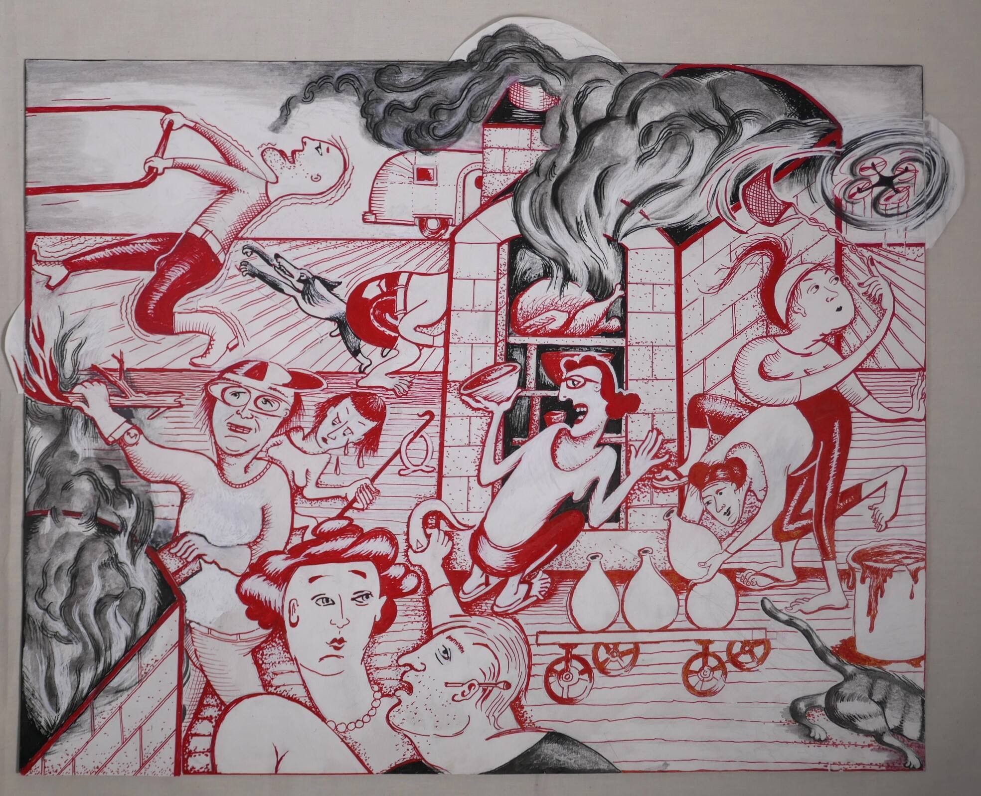 DescriptionBusy scene in a kiln yard. Clockwise from lower center: Profile head and shoulders of a man in black, holding a curved implement in his right hand. He faces the head and shoulders of a woman with red hair piled on her head, a red dress, and a string of pearls. A kiln with streaky dark grey smoke billowing out and red flames at the top. A woman in protective goggles pulls something out of the flames with her proper right hand. Behind her, a smaller female figure holds a crowbar in her proper left hand. Above them, a man straining backward to pull something heavy into the yard. A black dog stretches out its forepaws toward his lower back. To the right of the dog, a figure bends over to investigate what is in the kiln that dominates the upper half of the picture. Behind the figure, a trailer. Streaky dark grey smoke billows out of the kiln. To its right, a woman swatting at a small drone. Right center, a woman crouching, facing left, a bowl in her proper left hand, while another woman places jars on a low wheeled cart. A bucket of red liquid. In the lower right corner, a grey cat exiting the picture.Provenance