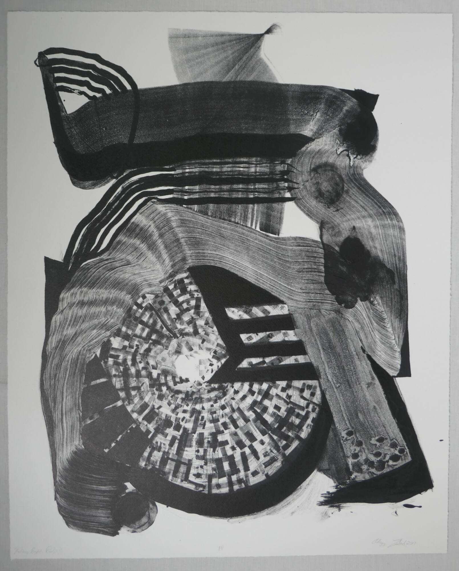 DescriptionThe lower part of the print is dominated by wheel seen from the side that seems to be made of black and white tiles within a strong black frame. An angular black shape and a streaky grey line with black ends are superimposed on it. Above the wheel is a tray with a delicate whisk – or perhaps a fan of pages, it’s hard to tell. The left side of the tray has five curved bars. A grey substance flows from the middle of the tray into the wheel. It also flows from the right side of the tray in a shape that resembles the profile of a bird. A small black bird with a crow’s beak and white feet seems to be standing on top of it.Provenance