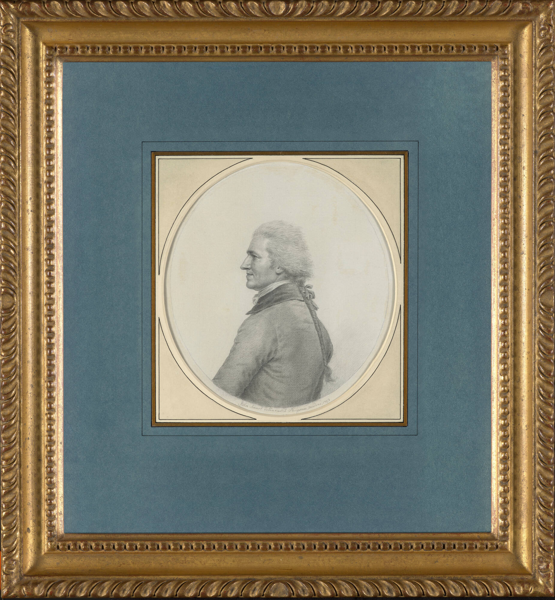 [5] Lots 184–89 were listed as, “The property of a descendant of the Dighton family.” Lot 184 is described as, “A self-portrait, head and shoulders in profile to dexter, with hair en queue, pencil on paper, rectangular gilt gesso frame, oval 6 3/8 in.; 16.2 cm. This portrait would seem to have been executed at about the same period as the self-portrait illustrated by Foskett (D.), John Smart, 1964, pl. III, fig. 7, which is dated 1797, but it is likely that as it belongs to the group of portraits below, which were all painted in Madras between 1790 and 1792. It may be a few years earlier in date than this, and prior to his departure from India in 1795.” According to the attached price list, lot 184 sold for 3,300 pounds. The illustration shows a framed border around the self-portrait, which conceals the artist’s inscription, and therefore explains the work’s then-unknown date.