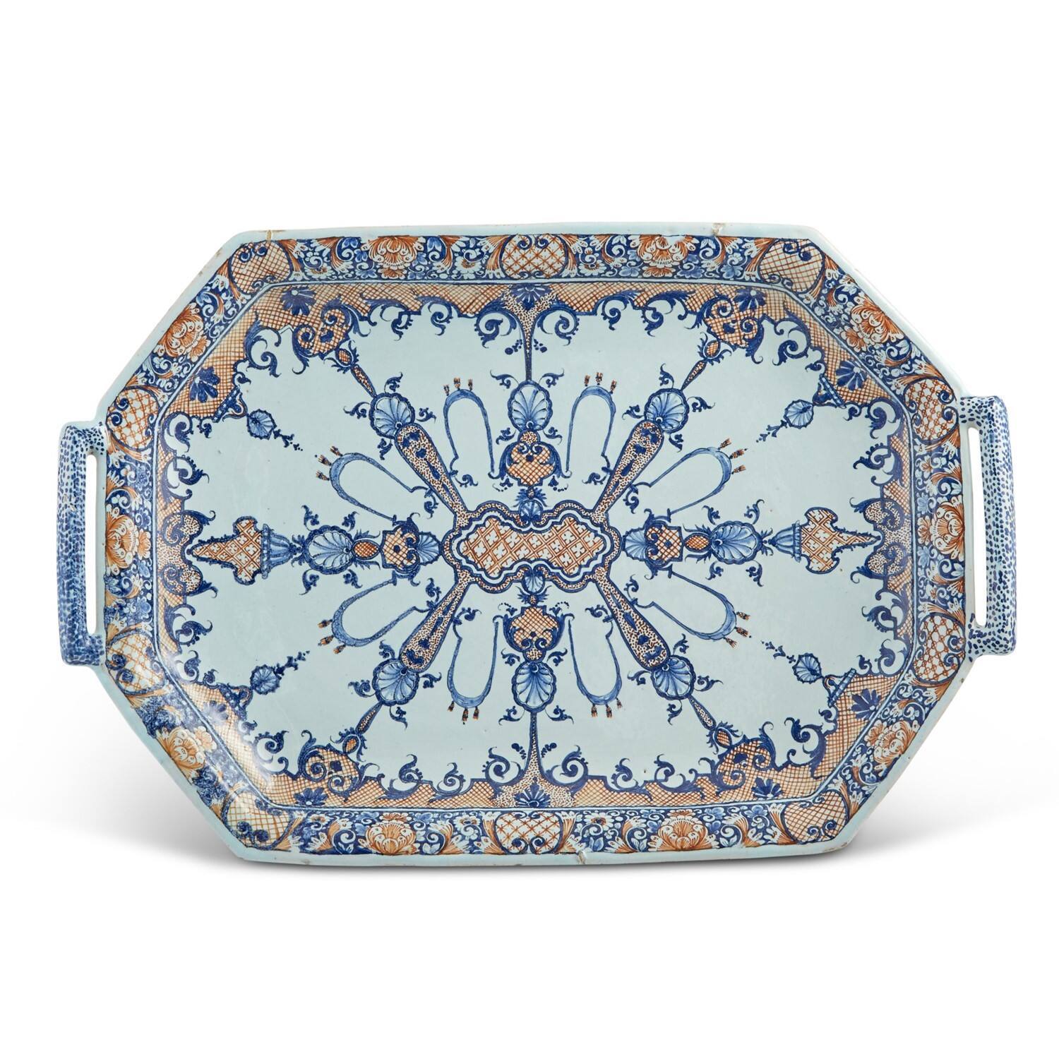 DescriptionA two-handled octagonal tray (bannette) painted in shades of blue and iron red with rocaille scrolls, shells, and lappets, the center with loops of tassels and shells issuing from a diaper-pattern bone-shaped cartouche.ProvenanceWith P. Metais, Rouen;