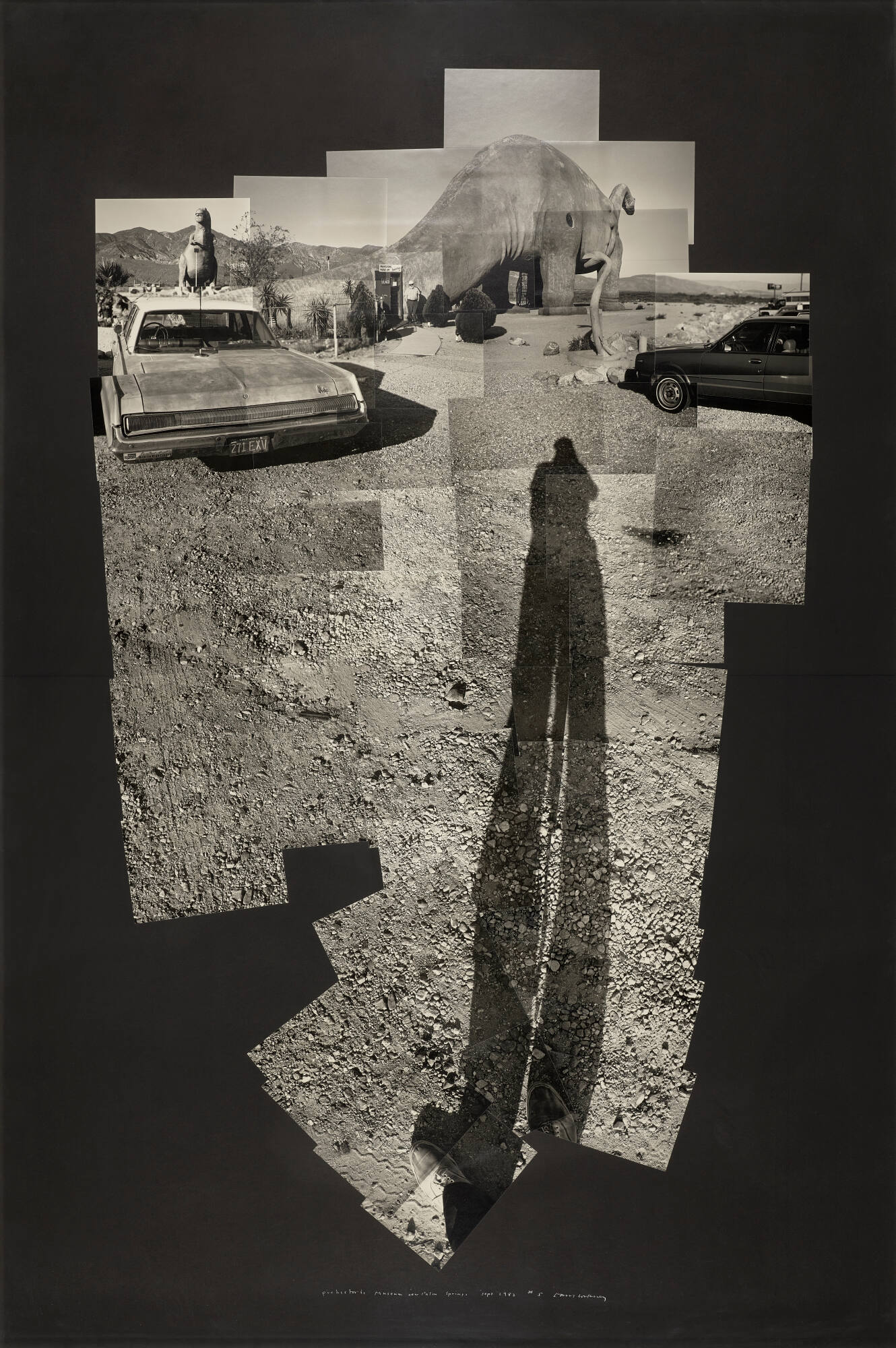 DescriptionImage composed of a photographic collage depicting the entrance to an outdoor museum with large dinosaur sculptures. The photographer's long shadow stretches across a pebbled parking lot with two cars and a small sidewalk leading to a bearded man standing with his hands in his pockets.Gallery LabelTo make this collage of nearly 70 individual prints, David Hockney expansively photographed the Cabazon Dinosaurs, a roadside attraction near Palm Springs, California. He then assembled the prints to create the illusion of three-dimensional space on a two-dimensional surface. This elaborate collage technique came from Hockney’s frustrations with what he saw as the limitations of the singular photograph. “I don’t use one perspective,” said Hockney, “I use very many. That is where photography is going, multiple perspectives.”