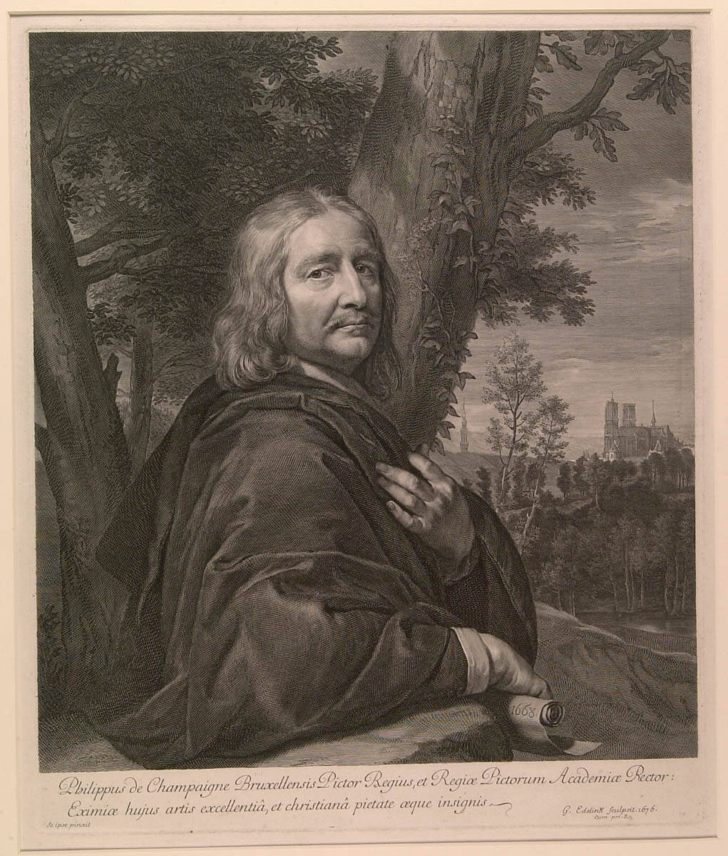 Gallery LabelBrussels-born painter Phillipe de Champaigne (1602–1674) enjoyed considerable success in France for his devotional works of art and penetrating portraits of members of the royal court. He was one of the founding members of the French Academy and later became one of its professors. This engraving by his friend and fellow Fleming Gérard Edelinck reproduces a lost self-portrait from 1668. The inscription celebrates the painter’s achievements while the view of Brussels in the distance identifies him as a native of the Spanish Netherlands (presentday Belgium).