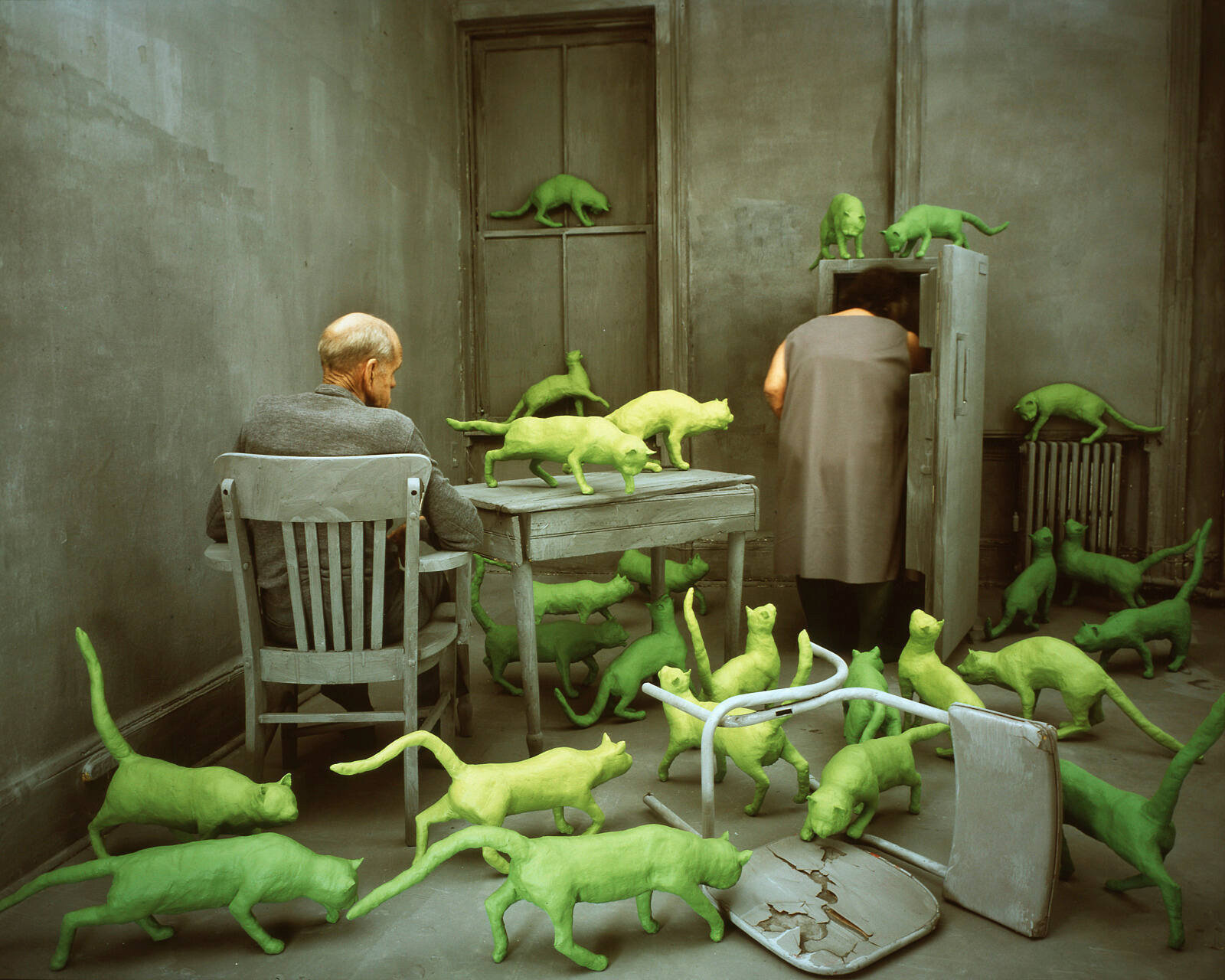 Twenty-five green cats stalk, beg, and play across a kitchen in Sandy Skoglund’s Radioactive Cats. To stage this photograph, Skoglund constructed a gray room-sized installation filled with sculptures, posed people as though nothing were out of the ordinary, and then photographed the outlandish scene. “The most critical aspect of my work … is that it is photographic,” said Skoglund. “I am asked why I do not produce my images with a computer: it would change the meaning. To know that what we are looking at has really existed, changes our perception.”