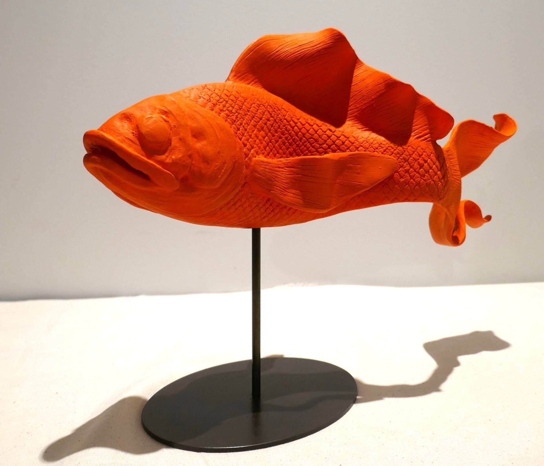 DescriptionA goldfish, painted entirely bright orange, mounted to a bronze pedestal. There are no scales on its head and its fins and tail are undulated.Copyright© Sandy Skoglund