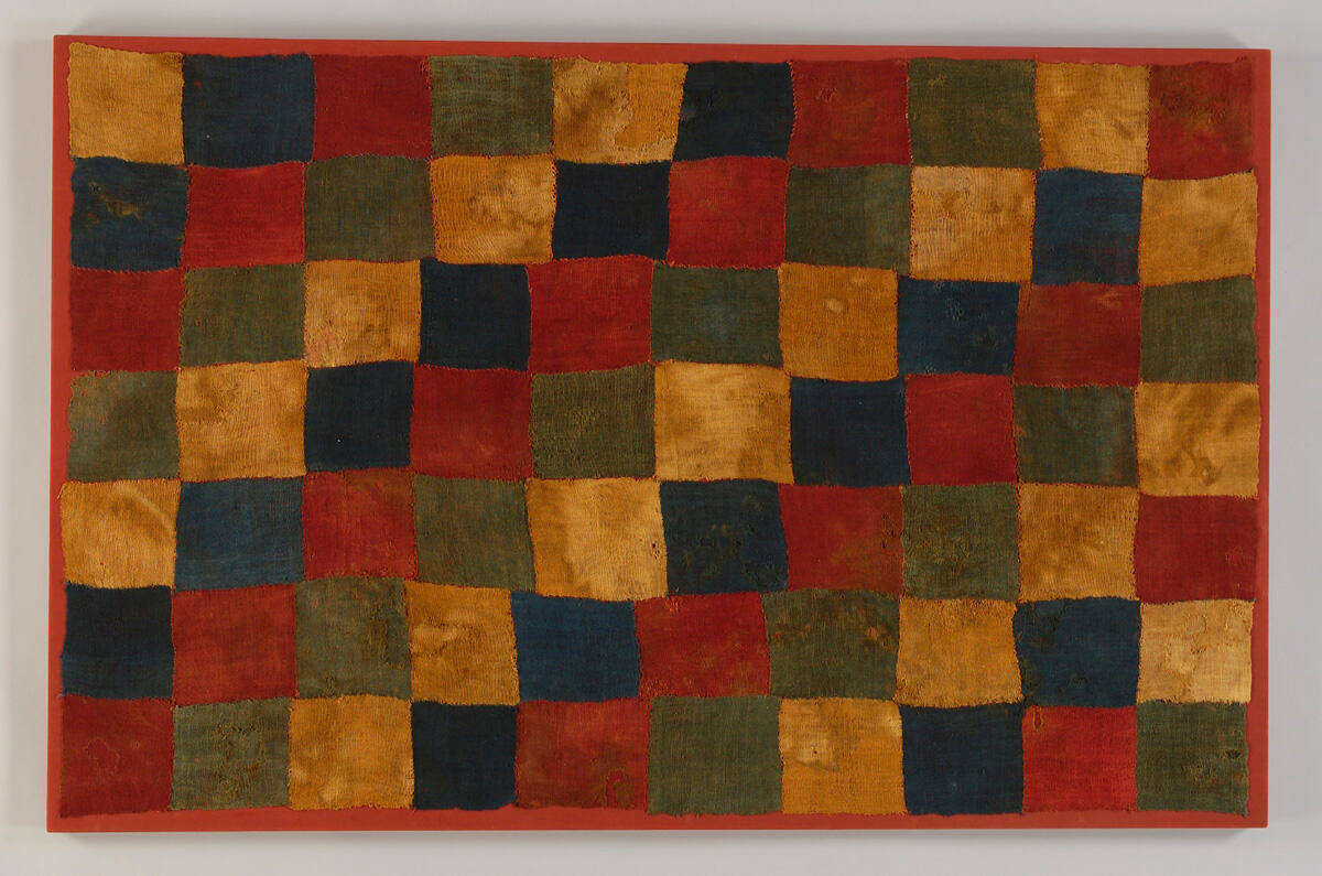 DescriptionCreated with a discontinuous warp weft/scaffolding technique, with overall squares of red, blue, green, and tan, in a checkerboard composition.