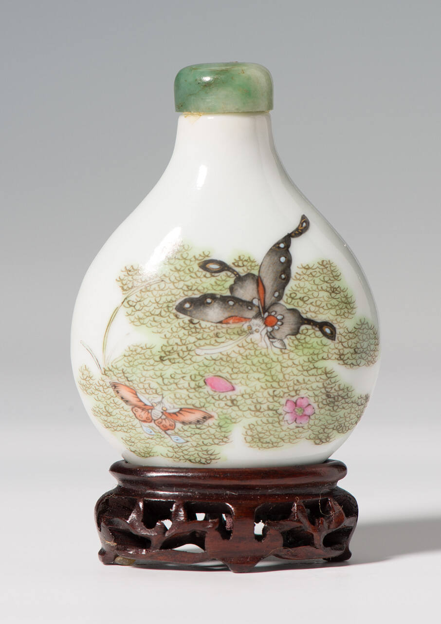 DescriptionOf flattened pear shape, painted in famille-rose enamels, on the front with two butterflies amid foliage, the reverse with another butterfly amid foliage beneath a fifteen-character inscription in Ju yuexuan style.