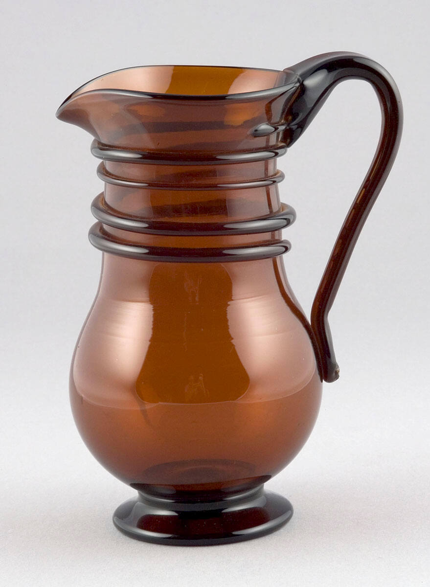 DescriptionAmber pitcher, small globular body resting upon small applied circular foot.