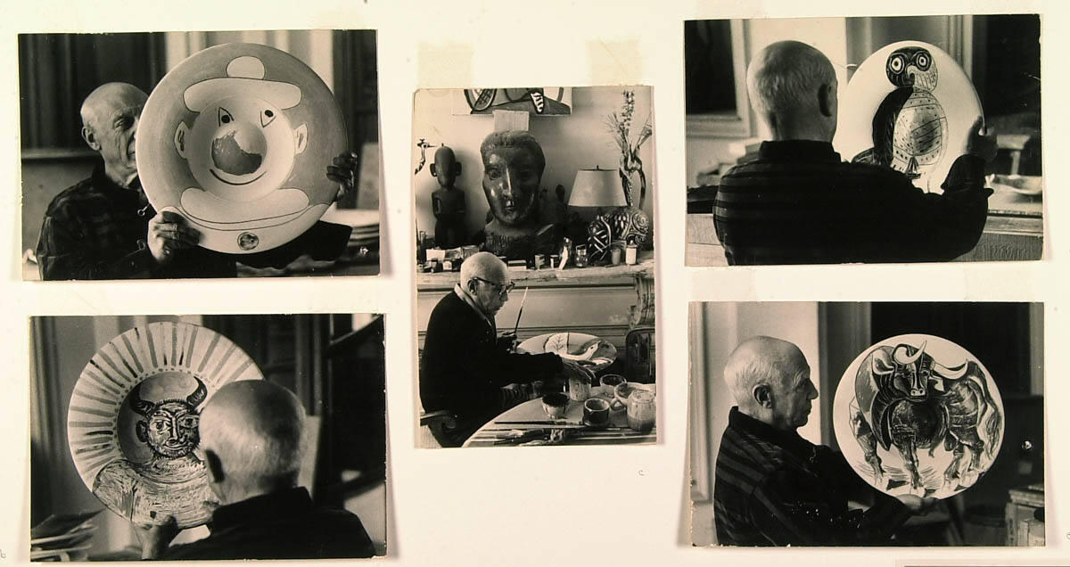 Picasso Starts to Paint Plates; Bronze Head of Dora Maar Above. Colors on Plates After Firing, and Examines Other Newly-painted Plates Before Firing