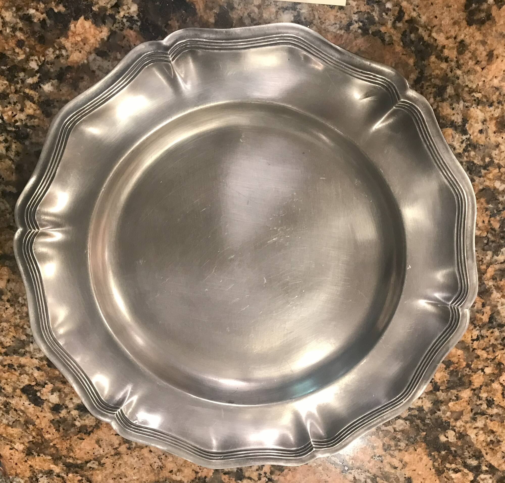 MarkingsRed sticker on back with black and white designs. Fabrication information also printed on this sticker in Dutch. It identifies the manufacturer and states that the alloy content is guranteed to be 94% pure tin and lead-free. A stamped "Finstain" mark is on the back. Several stamped marks below this to identify Les Potstainiers Hutois and Huy, Belgium as manufacturer/place of origin. The catalogue number "4012" is also stamped on the back, near the keyhole hanger hook.