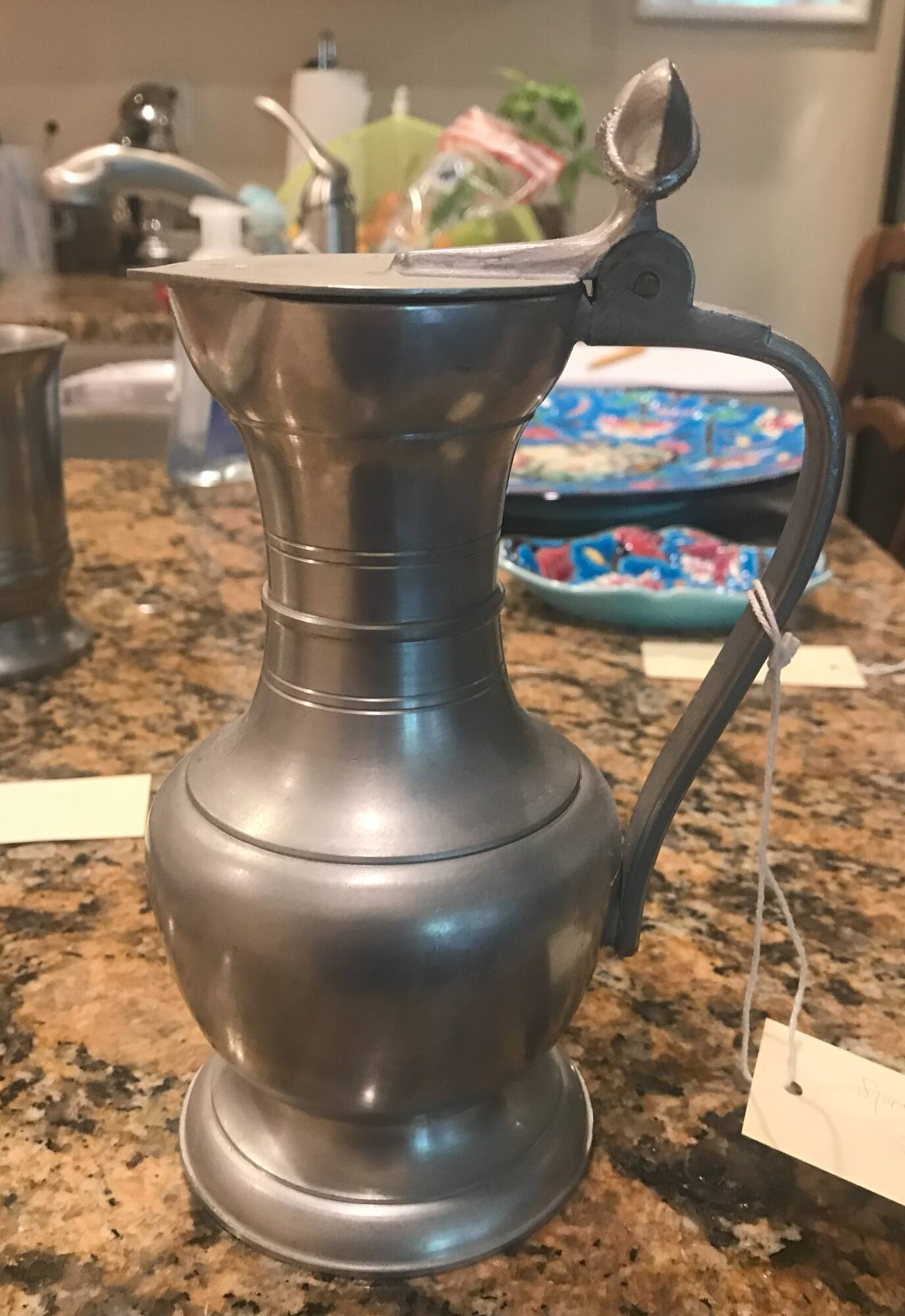 DescriptionPitcher with single horizontal bands around neck, waist and foot, with three double bands between neck and waist, with a thumb spout finial on handle.ProvenanceShirley Spiegel, Kansas City, MO;