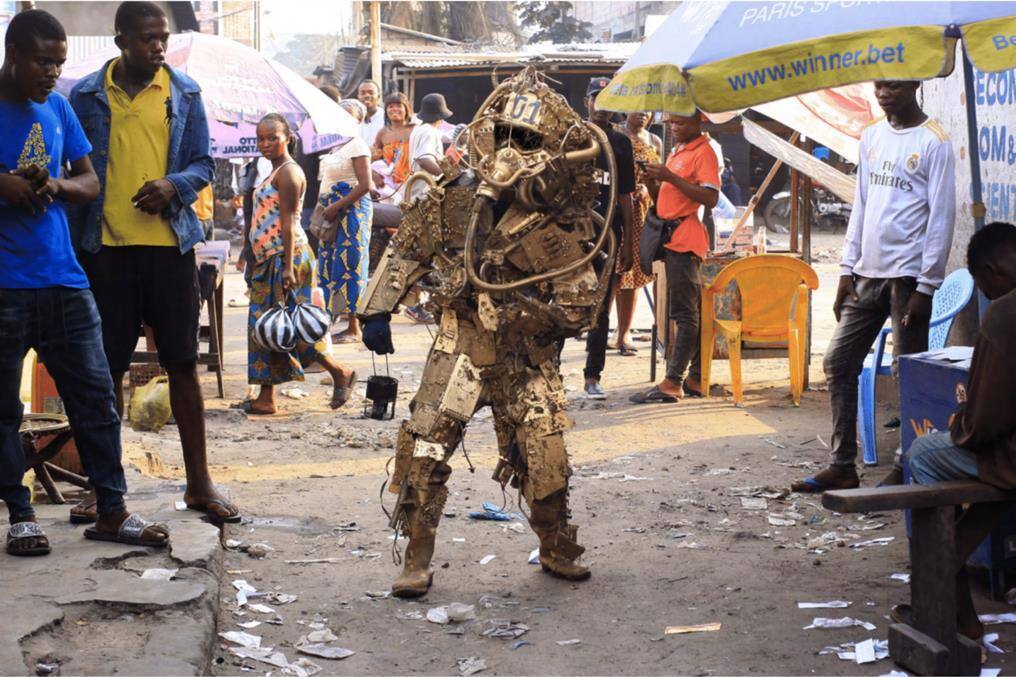 DescriptionThis colored image depicts an individual in a makeshift gold spacesuit walking in a busy open-air marketplace. Onlookers turn their heads toward the central figure.ProvenanceKongo Astronauts, Kinshasa, Democratic Republic of the Congo, 2024 [1];