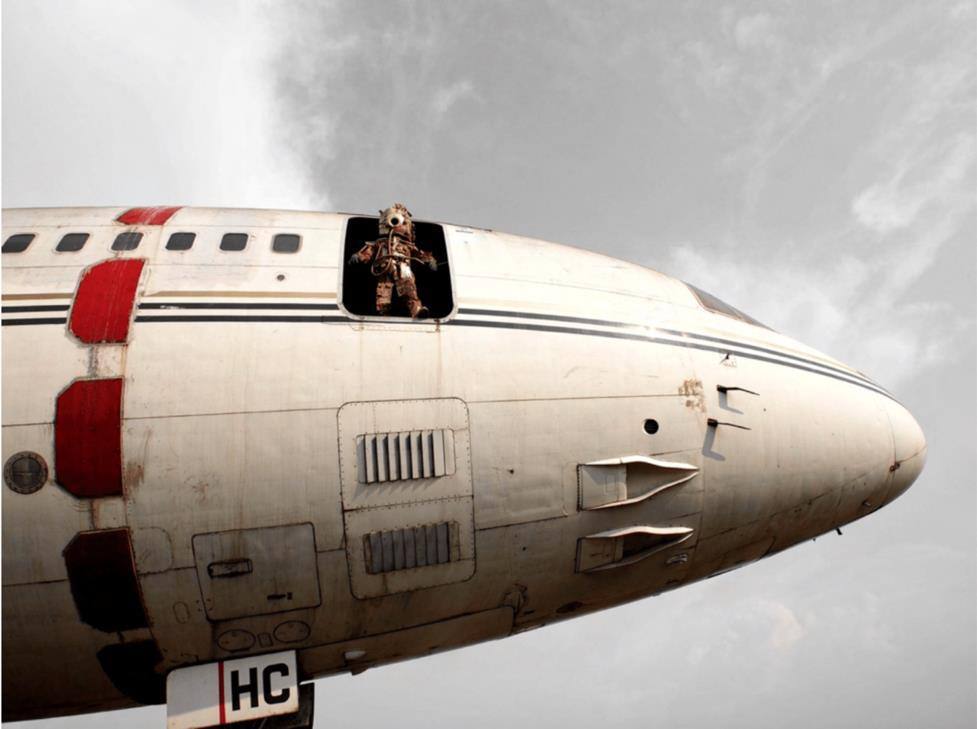 DescriptionThis colored image is of an individual in a makeshift gold spacesuit standing in the frame of an open airplane door. Shot from below, the large white cargo plane is backgrounded by a grey clouded sky.Exhibition HistoryCollege of Visual Arts and Design Galleries, University of