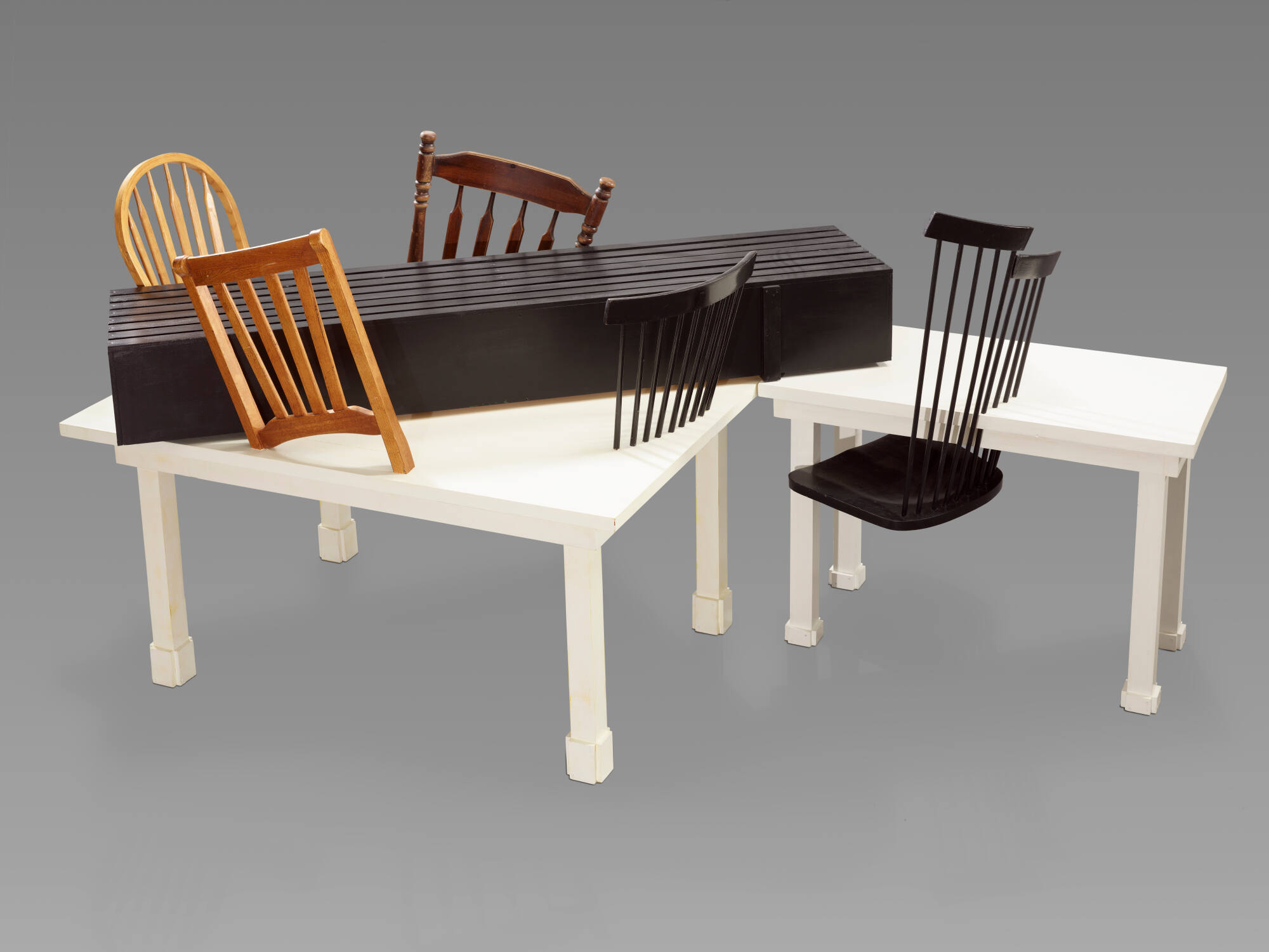 DescriptionThis is a sculpture composed of two white tables, with the disassembled backs of black and brown wooden chairs on top of them. A black rectangular box that looks like a coffin rests on top of the two tables as well.Exhibition HistorySiah Armajani, Alexander Gray Associates, New York, October 27–December 17, 2016