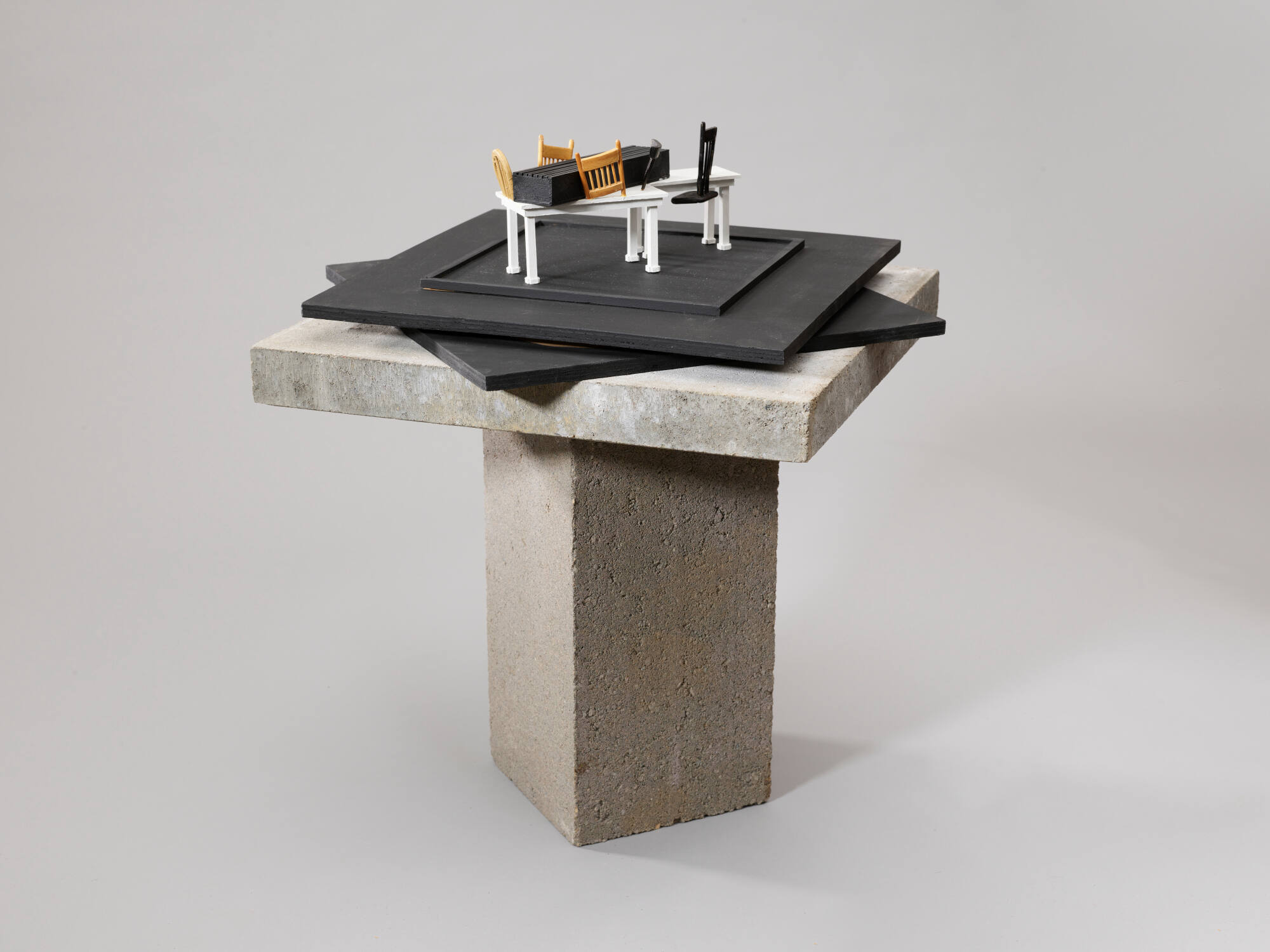 DescriptionThis is a model of two tables, one in front of the other, with the disassembled backs of chairs on top of them and what appears to be a black rectangular box that looks like a coffin with a slated lid. The tables sit within a square of a black base. Beneath the base is another black square base turned forty-five degrees. The polished concrete base beneath is turned another forty-five degrees, matching the angle of the first black square. The model and its bases rest on a concrete pedestal.Exhibition History