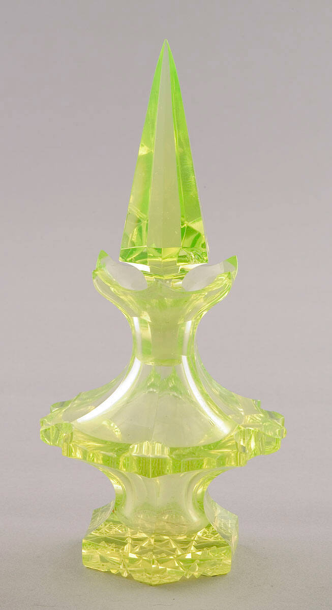 DescriptionBody: two superposed capstan-like forms with six pointed opening at top; bottom is a hexagon circumscribing six hexagrams which circumscribe center hexagram; stopper has hexahedral top.