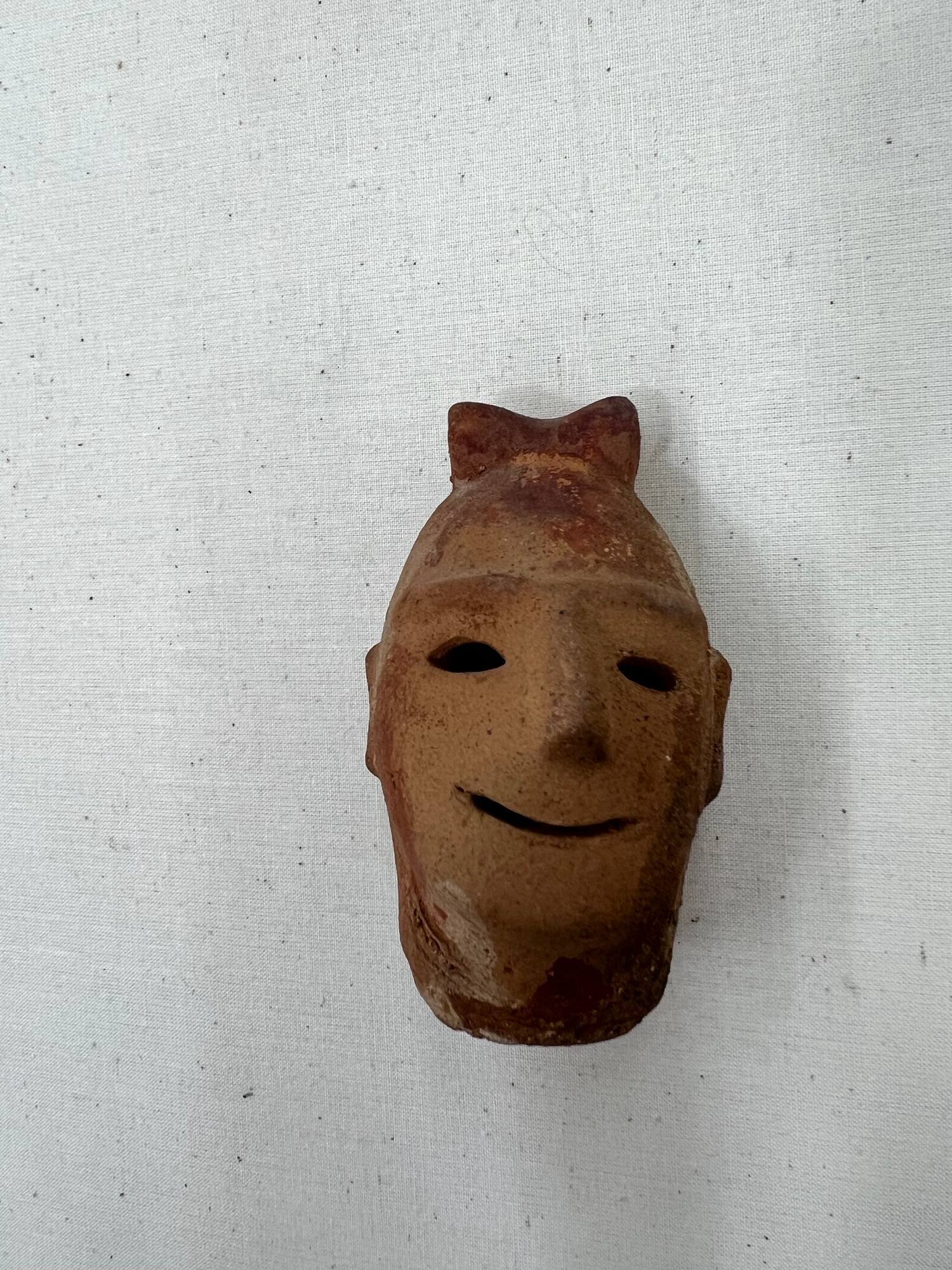 DescriptionHaniwa head is made of earthenware with traces of color. The face is oval and shows a smiling expression. The eyes and the mouth were cut out, and the nose, ears, eyebrows, and hair (possible head ornament) were added to the head. The top half of the head and both sides of the face show traces of reddish-brown color, suggesting this figure was painted.