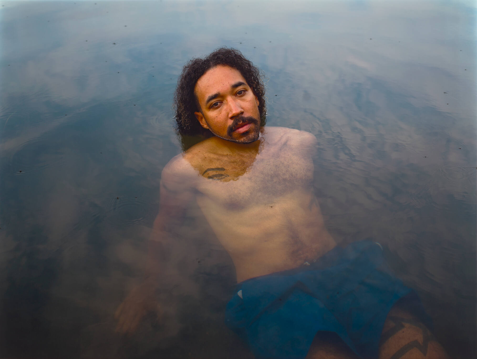DescriptionImage of a shirtless man lying in a shallow body of water with his head raised. He's wearing blue swim trunks and has long hair and a short beard.ProvenanceJess T. Dugan, St. Louis, MO ;
