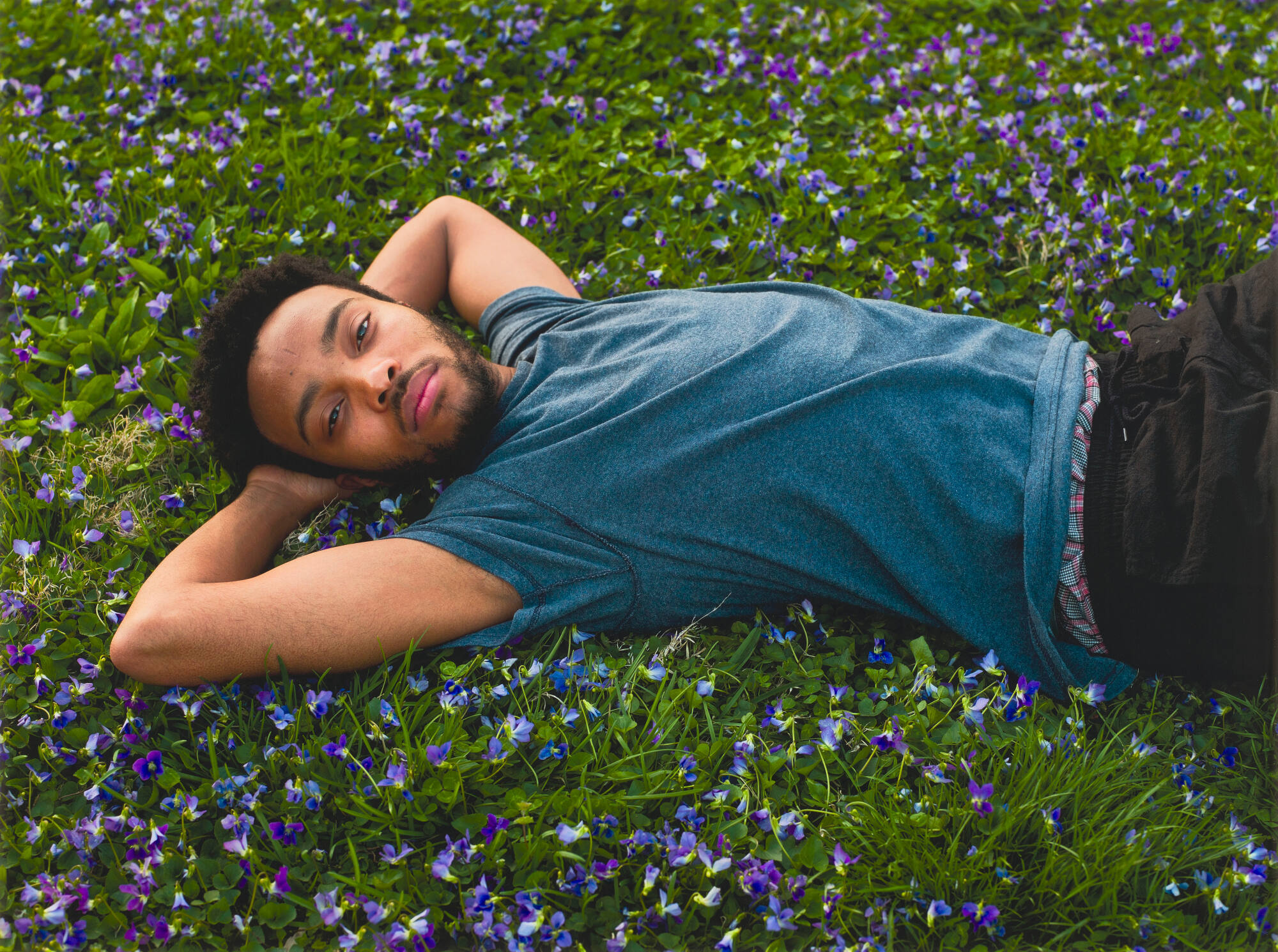 DescriptionImage of a bearded man lying on his back with arms behind his head in a field of grass with purple flowers. He's wearing a blue t-shirt and dark pants.ProvenanceJess T. Dugan, St. Louis, MO ;