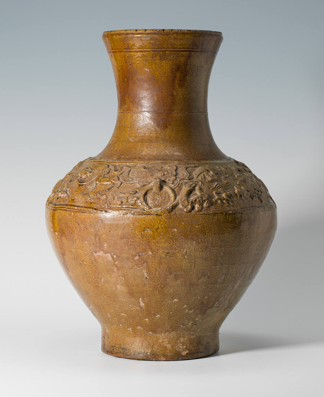 DescriptionVase with a greenish brown glaze, with a tall neck flared at the top, with a raised band of animals around the shoulder and below the neck, and two incised rings around the middle and top of the neck.