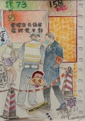 There are various stickers, numbers, and Chinese text across the rest of the drawing with two numbers at the top representing the air quality index done by China and America. The Chinese reading is in green and the American reading is in dark brown.