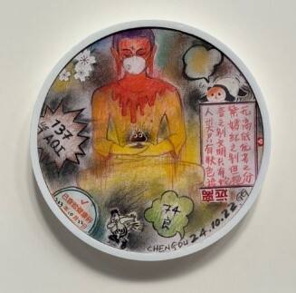 Not on viewThe background is mottled with areas of color that fade and mix with black charcoal. To the left is the American Air Quality Index, which reads, “137”. The green bubble at the bottom, which is the Chinese Air Quality Index, reads, “74 Good”. Several stickers decorate the perimeter of the drawing, and there are several text boxes in Chinese.
