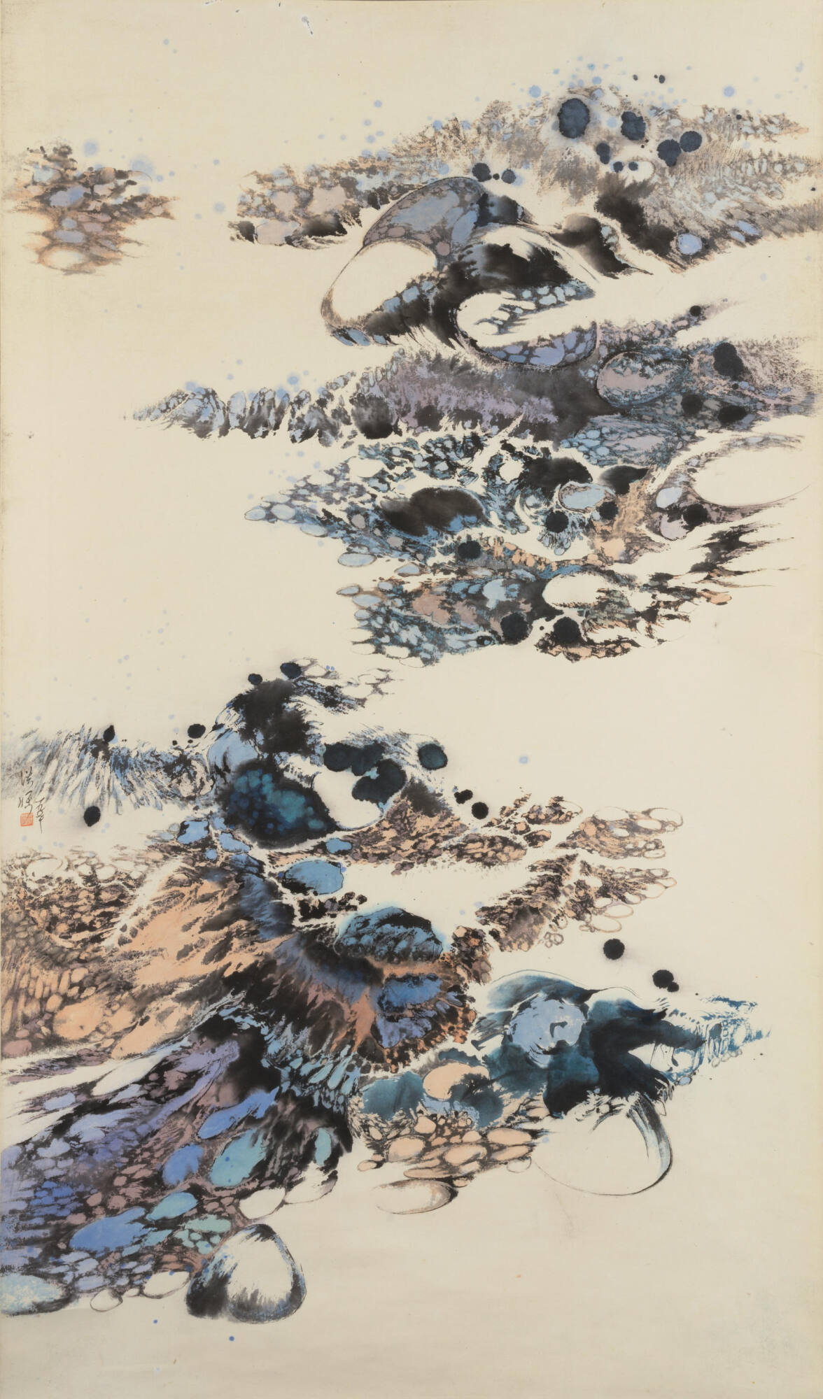 DescriptionThe painting features a range of abstract forms in a diagonal movement from lower left to upper right. The forms, which suggest water flowing over hundreds of small rocks, are comprised of lines, blotches, and dots in moist ink with light blue, beige, and purple.Exhibition HistoryTaipei, National Museum of History, The 14th Annual Fifth Moon Group Exhibition, Taipei, 1970.