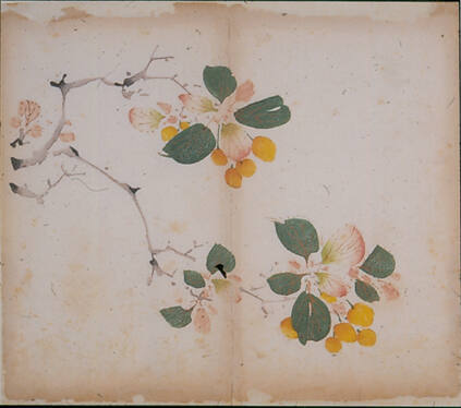 Gallery LabelRipened fruit suggests the richness and abundance nurtured in a blissful orchard. These prints depicted the juicy fruits frequently found on the dining tables of Chinese families. For example, lotus root and water caltrops-favorite seasonal food-were used to make special dishes, soups or snacks.