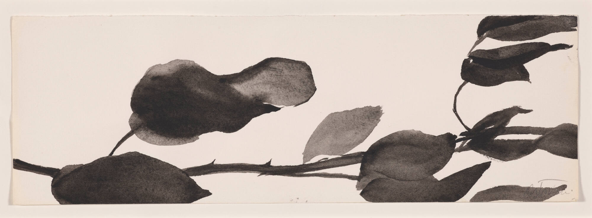 DescriptionThis small ink and watercolor painting on paper is one of a series of studies for the Goldberg Variations. The work depict rose stems with leaves rendered against the white ground of the bare paper. Wet black ink and paint is applied with a brush, which gives variation to the value and texture of the media.