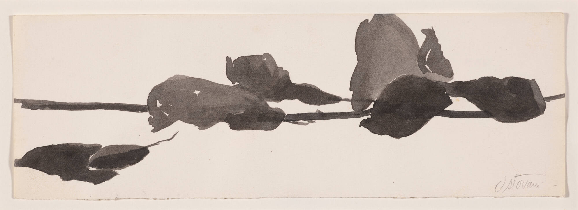 DescriptionThis small ink and watercolor painting on paper is one of a series of studies for the Goldberg Variations. The work depict rose stems with leaves rendered against the white ground of the bare paper. Wet black ink and paint is applied with a brush, which gives variation to the value and texture of the media.