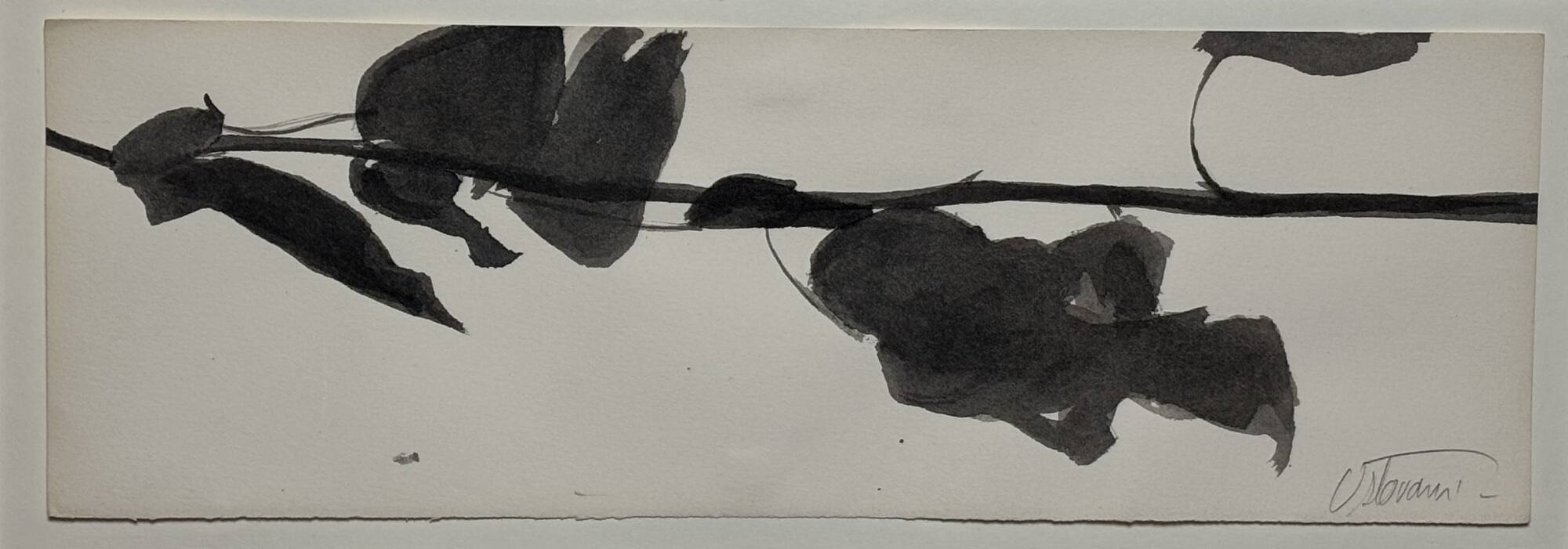 DescriptionThis small ink and watercolor painting on paper is one of a series of studies for the Goldberg Variations. The work depict rose stems with leaves rendered against the white ground of the bare paper. Wet black ink and paint is applied with a brush, which gives variation to the value and texture of the media.