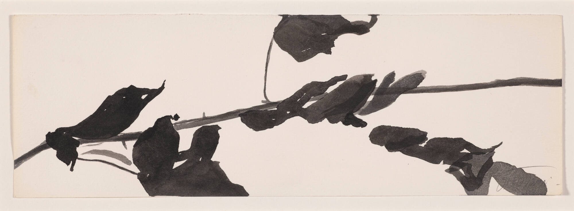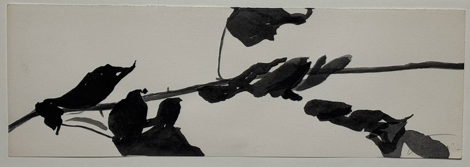 DescriptionThis small ink and watercolor painting on paper is one of a series of studies for the Goldberg Variations. The work depict rose stems with leaves rendered against the white ground of the bare paper. Wet black ink and paint is applied with a brush, which gives variation to the value and texture of the media.