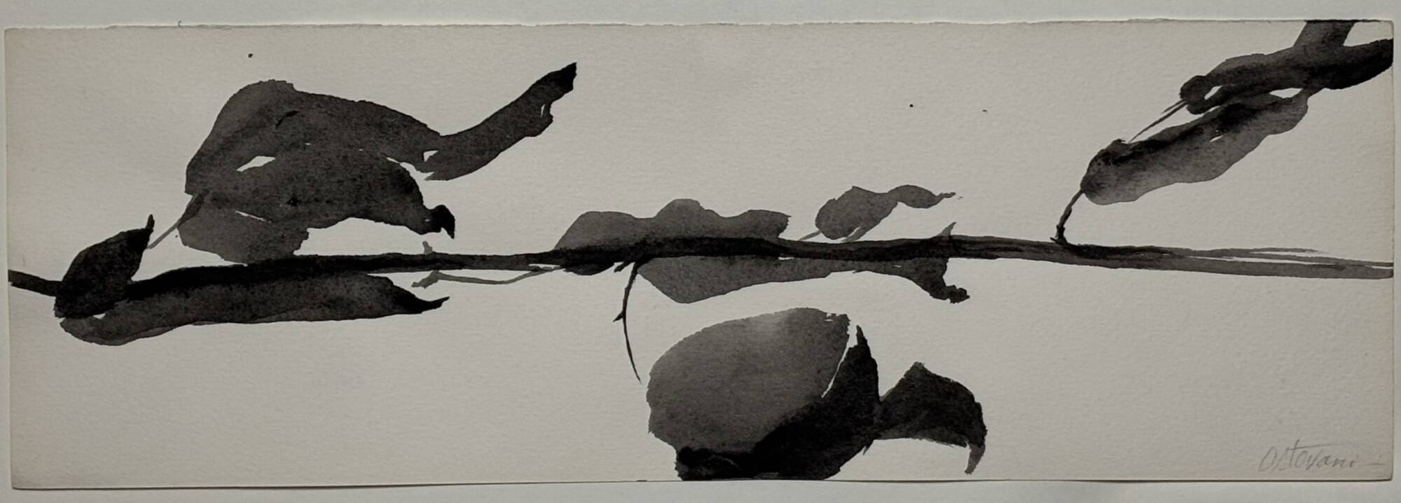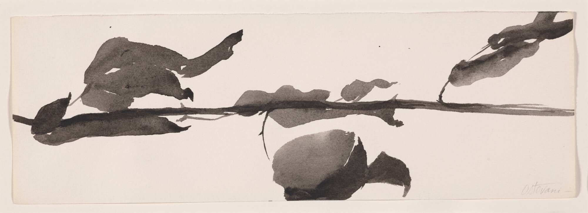 DescriptionThis small ink and watercolor painting on paper is one of a series of studies for the Goldberg Variations. The work depict rose stems with leaves rendered against the white ground of the bare paper. Wet black ink and paint is applied with a brush, which gives variation to the value and texture of the media.
