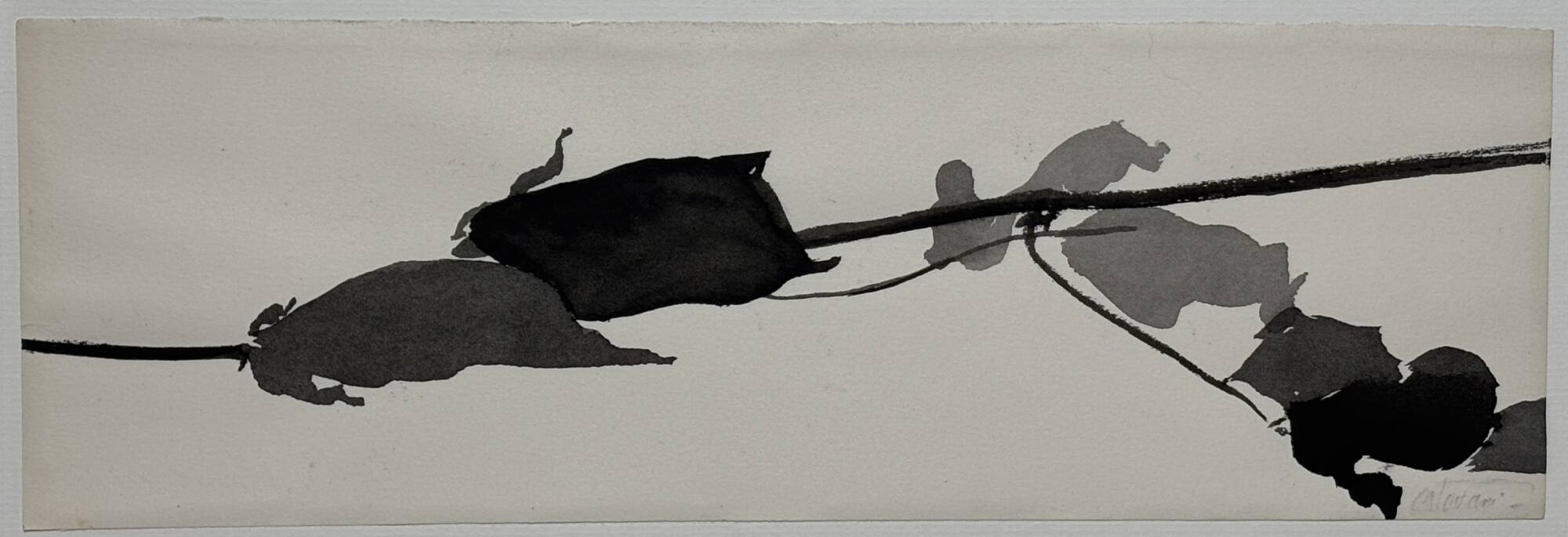 DescriptionThis small ink and watercolor painting on paper is one of a series of studies for the Goldberg Variations. The work depict rose stems with leaves rendered against the white ground of the bare paper. Wet black ink and paint is applied with a brush, which gives variation to the value and texture of the media.