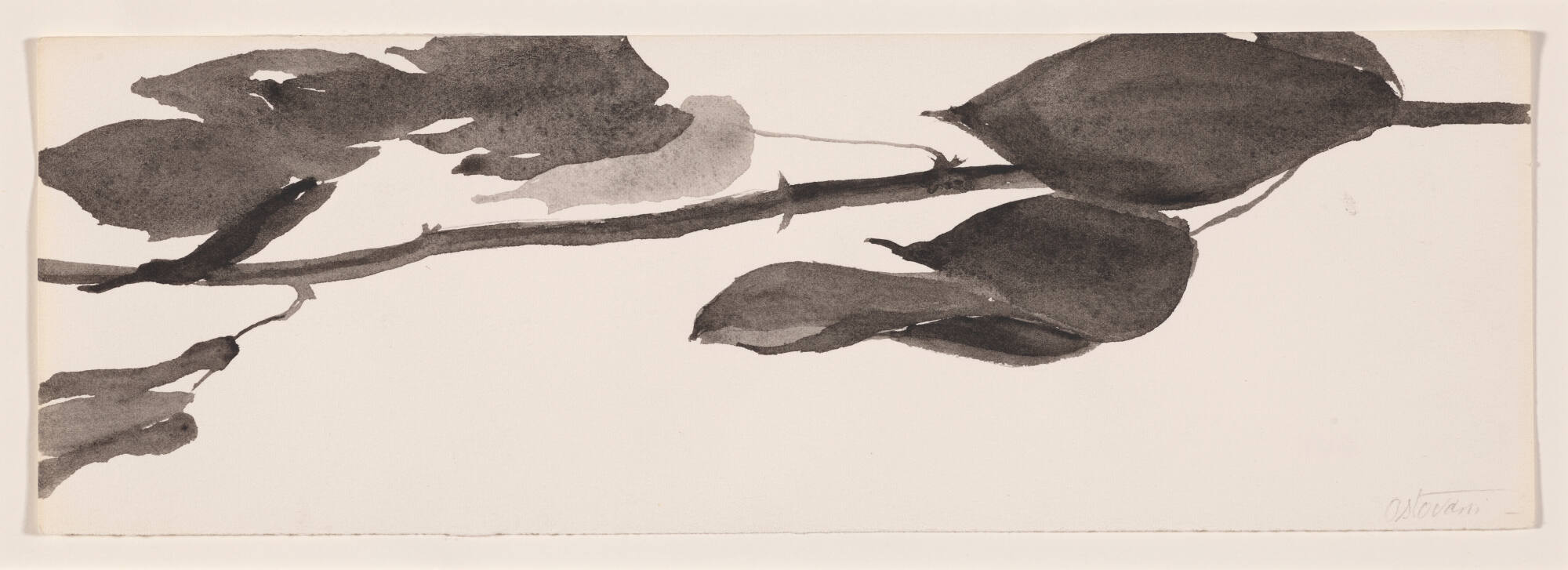 DescriptionThis small ink and watercolor painting on paper is one of a series of studies for the Goldberg Variations. The work depict rose stems with leaves rendered against the white ground of the bare paper. Wet black ink and paint is applied with a brush, which gives variation to the value and texture of the media.