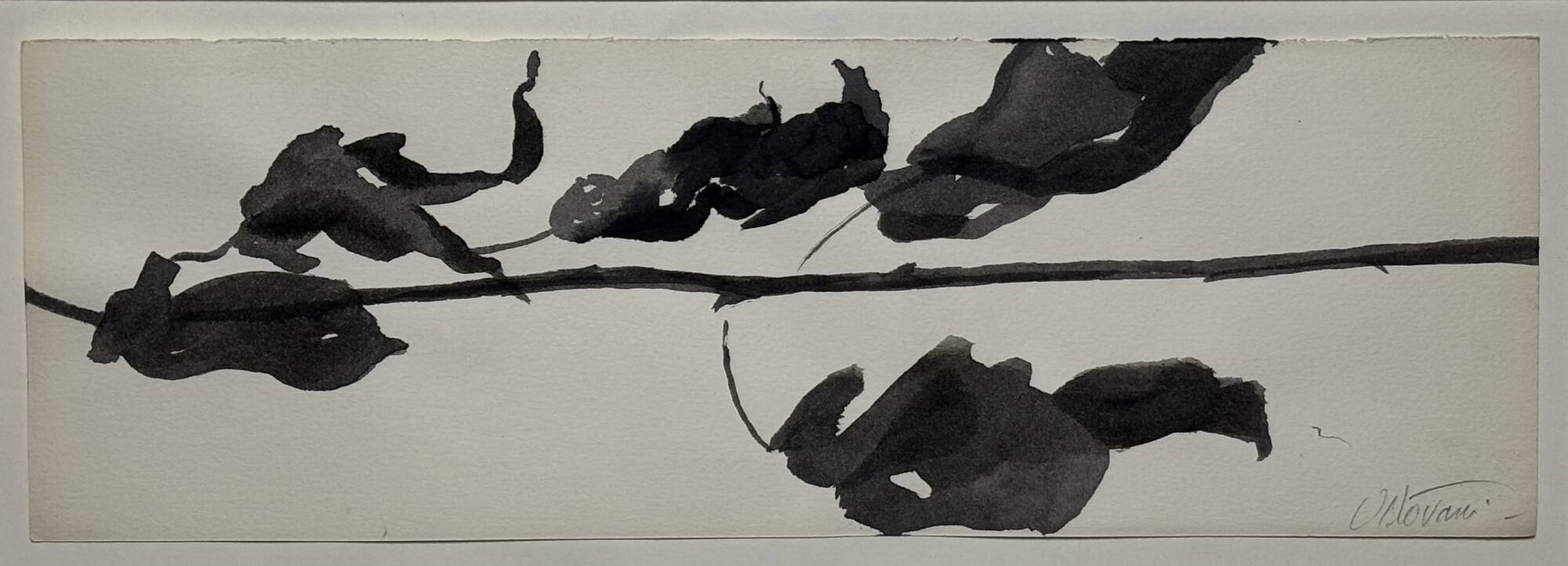 DescriptionThis small ink and watercolor painting on paper is one of a series of studies for the Goldberg Variations. The work depict rose stems with leaves rendered against the white ground of the bare paper. Wet black ink and paint is applied with a brush, which gives variation to the value and texture of the media.