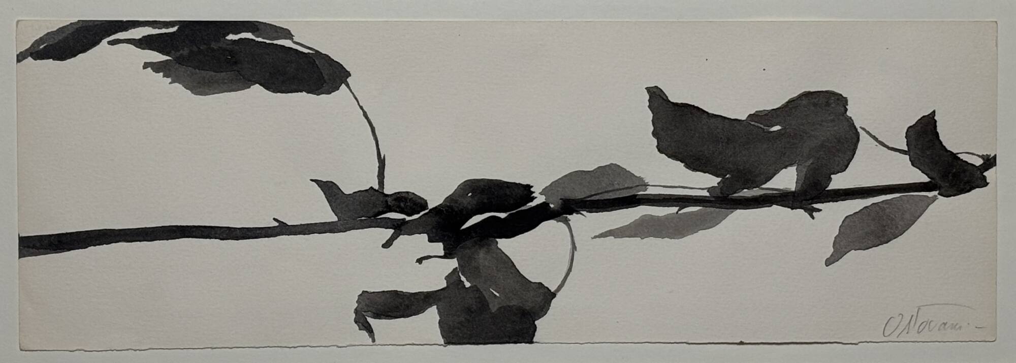 DescriptionThis small ink and watercolor painting on paper is one of a series of studies for the Goldberg Variations. The work depict rose stems with leaves rendered against the white ground of the bare paper. Wet black ink and paint is applied with a brush, which gives variation to the value and texture of the media.