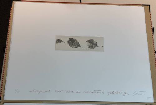 DescriptionThis lithograph print was created for the Aria of the Goldberg Variations. These prints depict leaves, the subject matter of the composition. The prints are printed on Japanese paper, each print is approximately 20 x 26 inches.